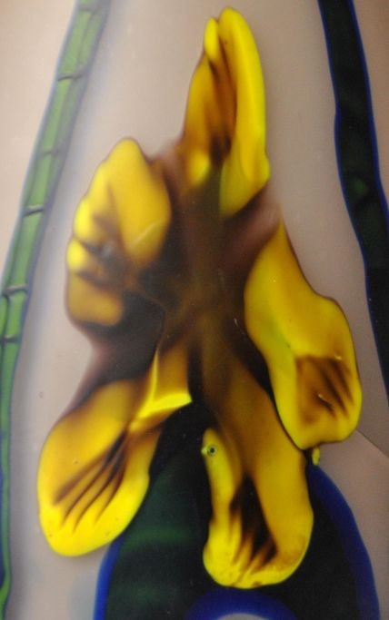 Rosefarvet glas med overfang med blomster og planteornamentik i violet, brunt, gult og grønt. Højde: 27 cm. Dia.: 20 cm.