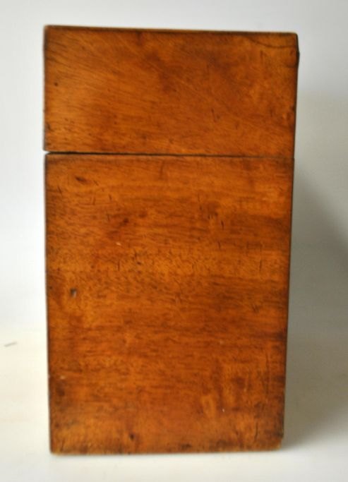 Engelsk empire skrin med to kantineflasker, 19. årh. Mahogni. Med tre rum. I træ med metal håndtag og lås i ben. To flasker i klart glas. H: 22,5 cm. L: 27,5 cm. D: 12,5 cm.