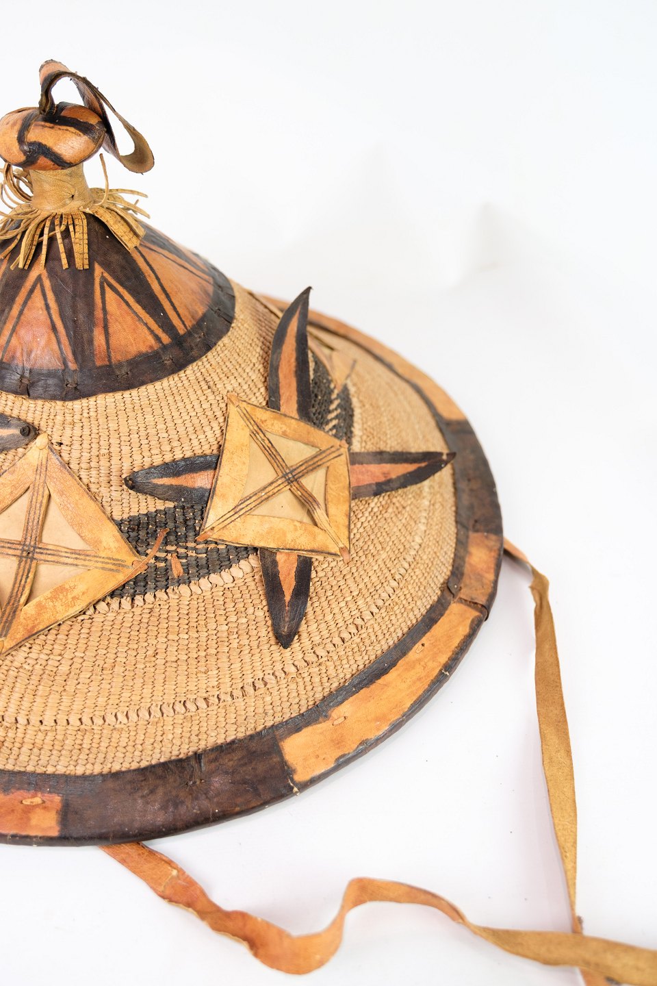 Traditionel Fulani-hat fra Vestafrika, håndlavet i flettet strå med detaljer i læder og dekorationer i geometriske mønstre. Hatten har den karakteristiske form med læderbeklædt top og en solid hagerem. Denne type hovedbeklædning, også kaldet Tengaade, bæres af Fulani- og Wodaabe-folket og er både praktisk som solbeskyttelse og et vigtigt symbol på identitet og status. Et autentisk stykke af afrikansk kulturhåndværk.