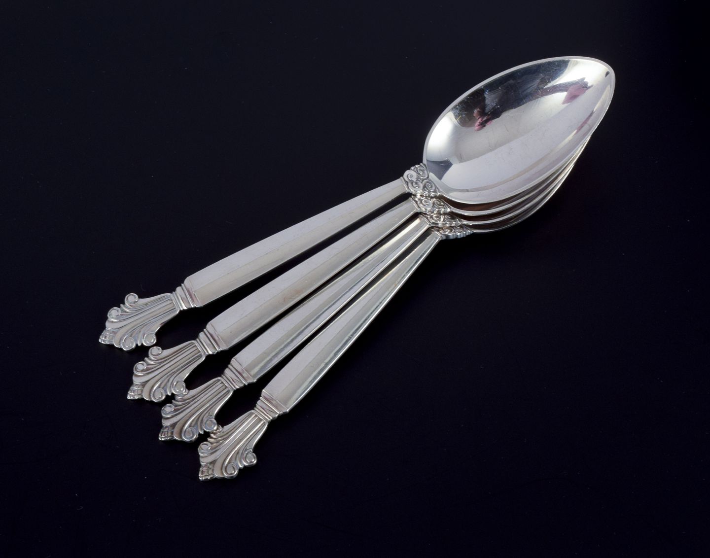 Georg Jensen Dronning, et sæt på fire spiseskeer i sterlingsølv.