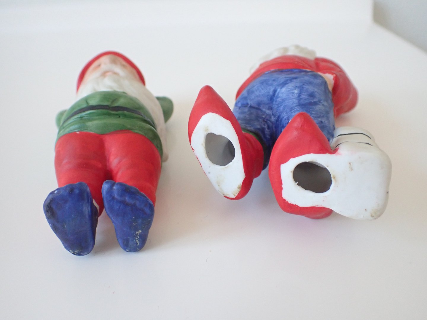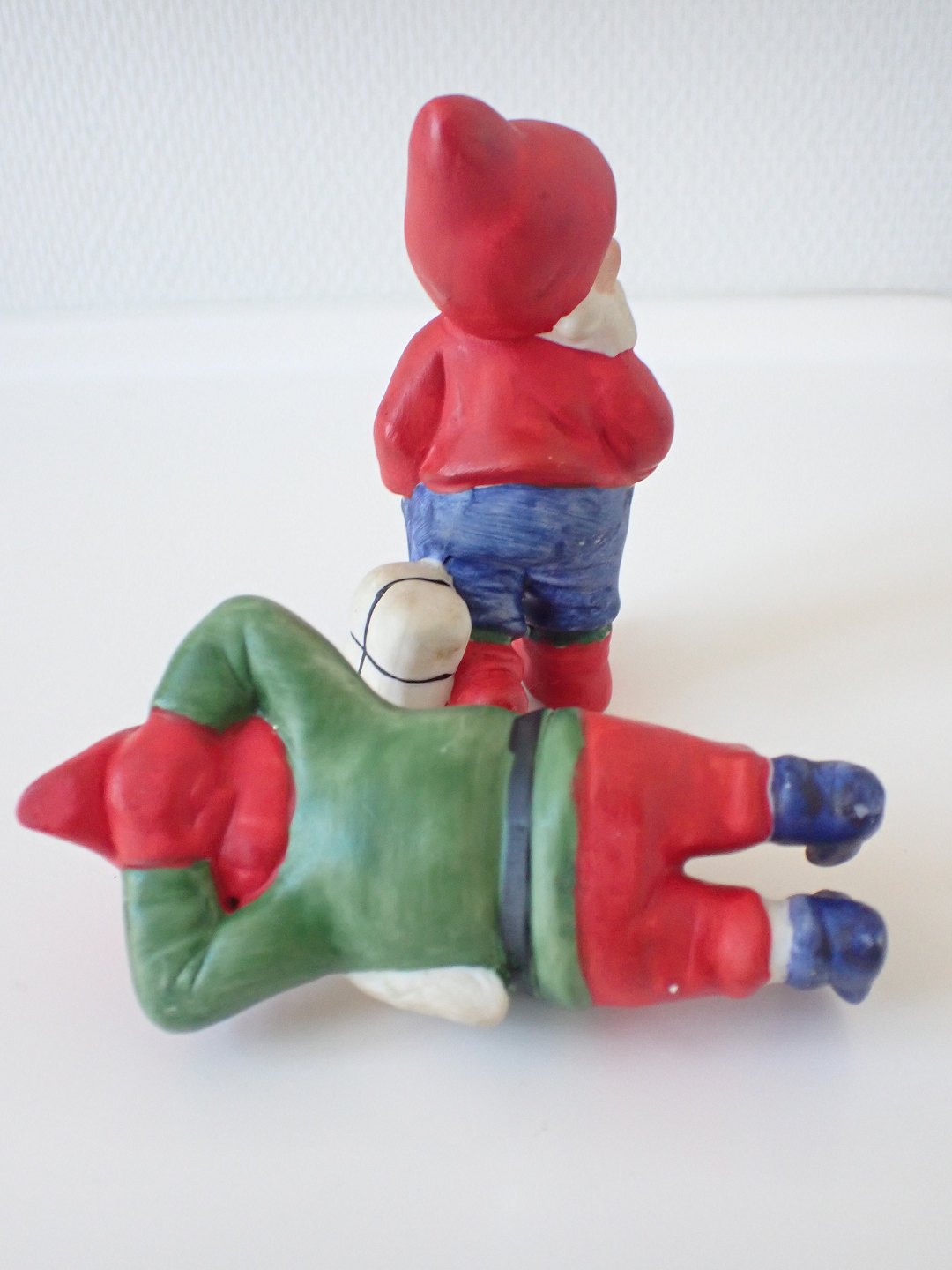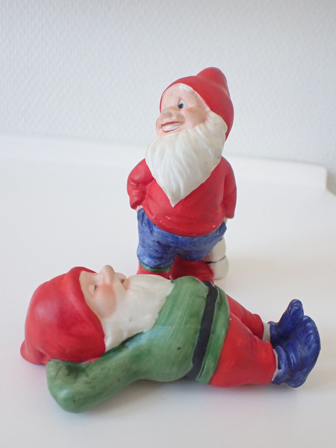 2 store håndmalede biscuitnisser, formentlig tyske. En ligger og sover og en står med en pakke. Fra 1970-erne. Højde: 10 cm. I fin stand. Sælges individuelt for 275 kr. pr. stk.