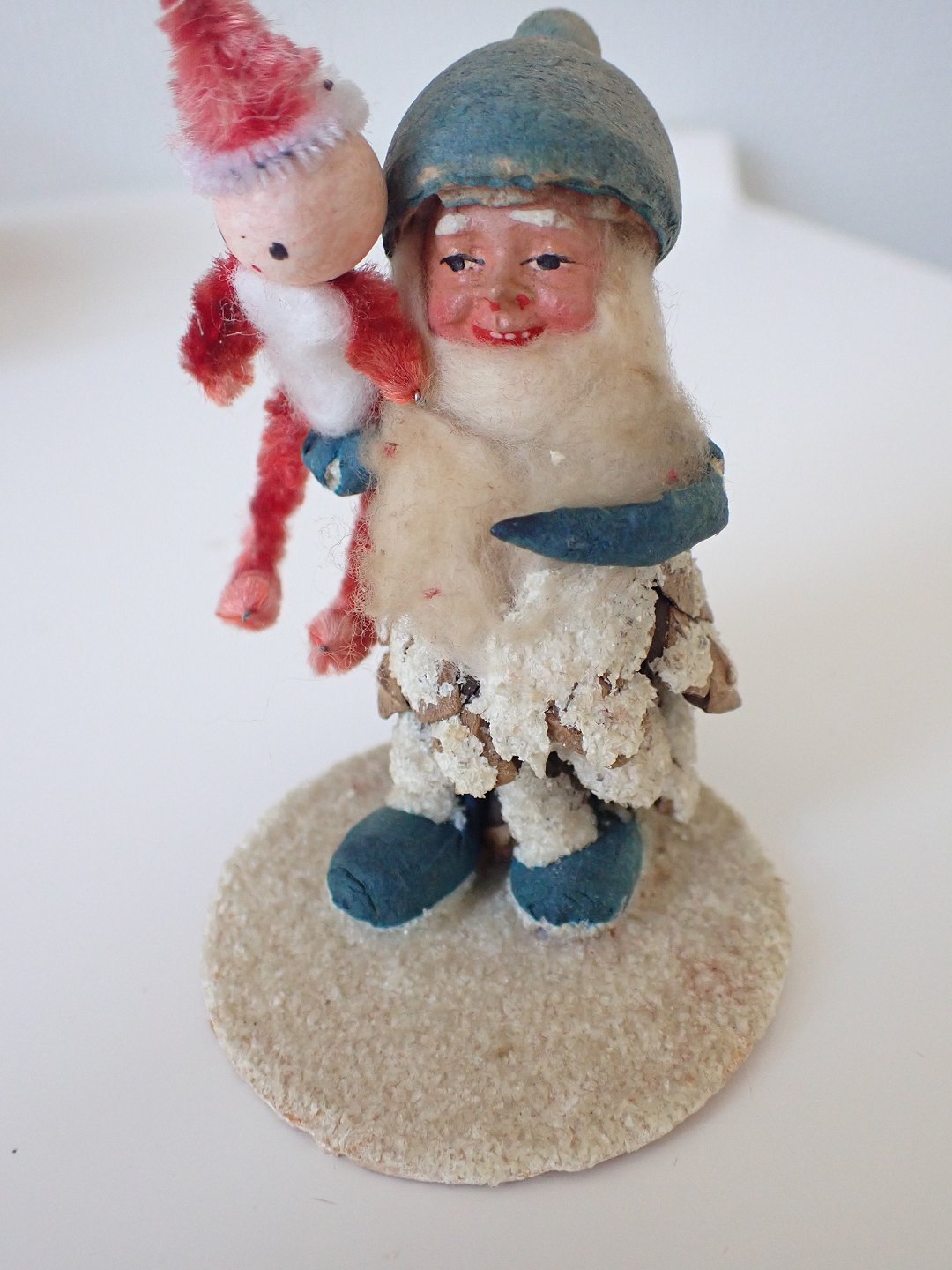 5 koglenisser med henholdsvis grangren, risengrød, piberensernisse, gavesæk, banjo og harmonika. Håndmalede, danske ca. 1930. Højde: 6,5 - 7,5 cm. I pæn tidstypisk stand.