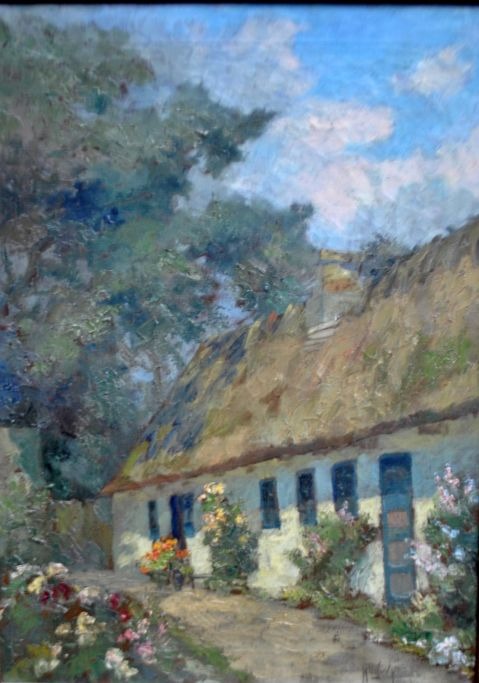 Pedersen, Hugo V. (1870 - 1959) Danmark: Blomster foran et hus