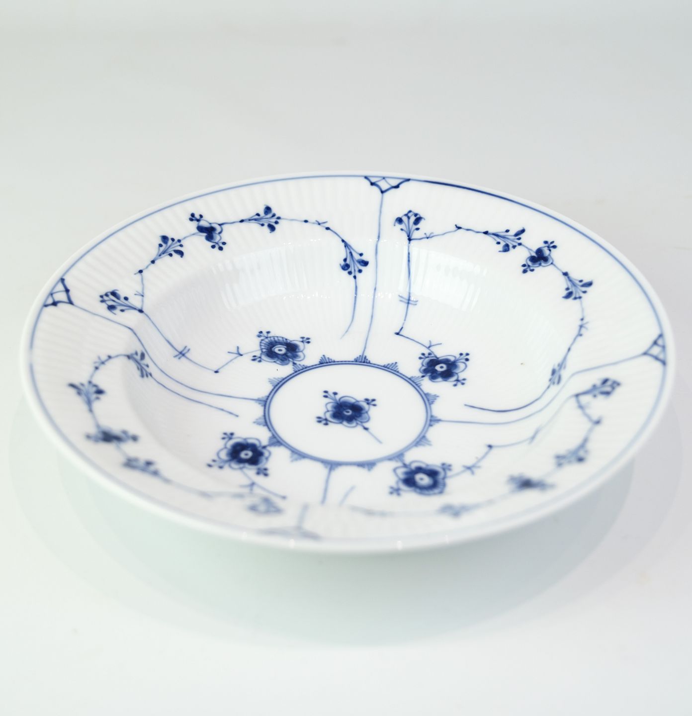 Early plate from Royal Copenhagen in the classic blue-fluted fluted frame. Hand-painted porcelain with cobalt blue decoration and the characteristic fluted surface. Produced before 1923, as evidenced by the back stamp without wavy lines.