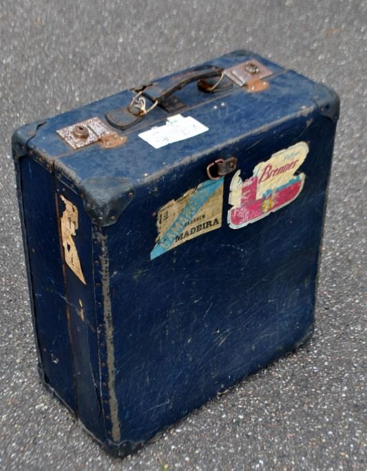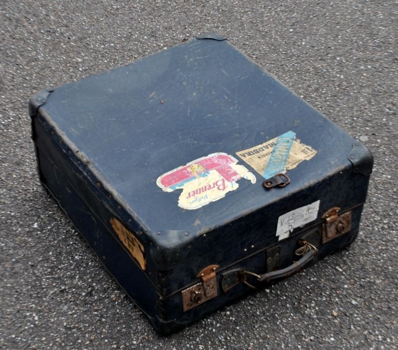 Kuffert, 20. årh. Med tyske mærkater. Bred hank. To låse, rustne og uden nøgle. L: 54 cm. B: 49 cm. H: 26 cm.