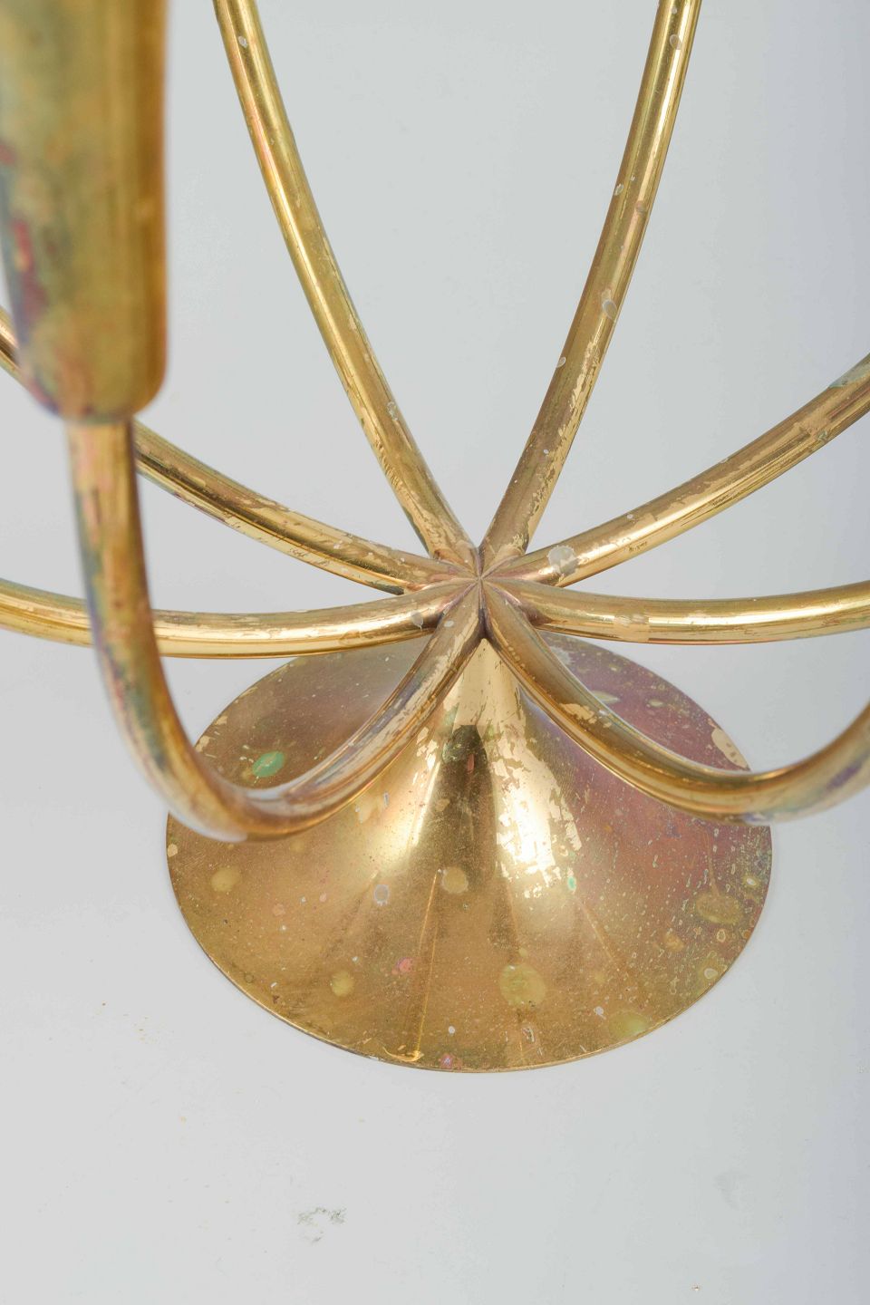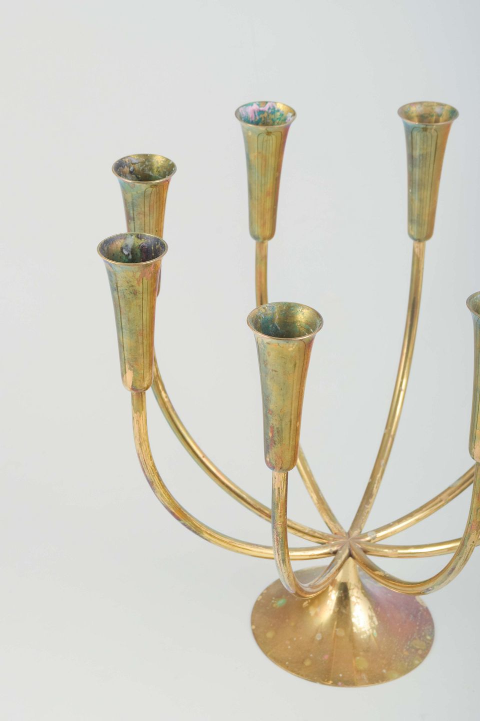 Kandelaber i messing med otto buede arme, trumpetformede holdere og konisk fod.