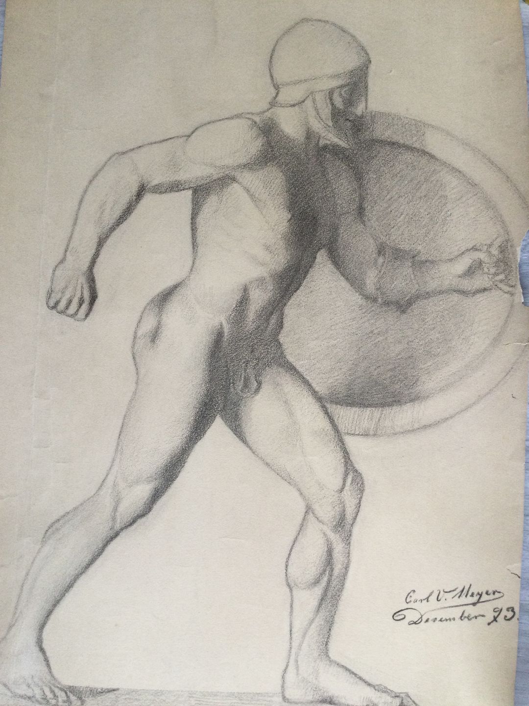 Akademitegning af Carl V. Meyer - Nøgen kriger med skjold 1893.