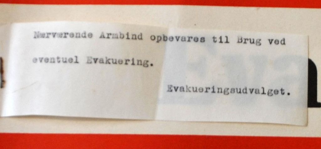 Evakuerings arm bind i papir, 1940 - 1945, 2. WW. Danmark. 36 x 8,5 cm. Med fastgjort seddel af papir med teksten: Nærværende Armbind opbevares til Brug ved eventuel Evakuering. Evakueringsudvalget.