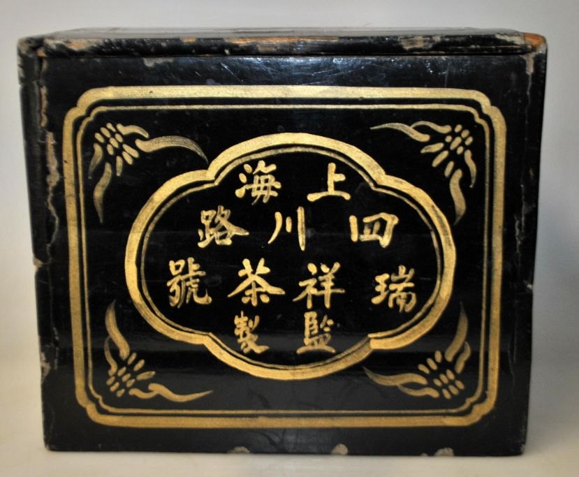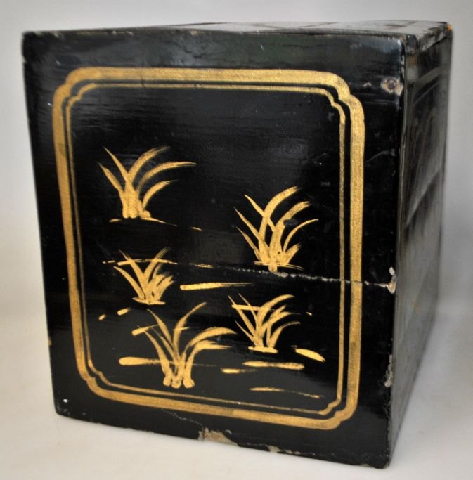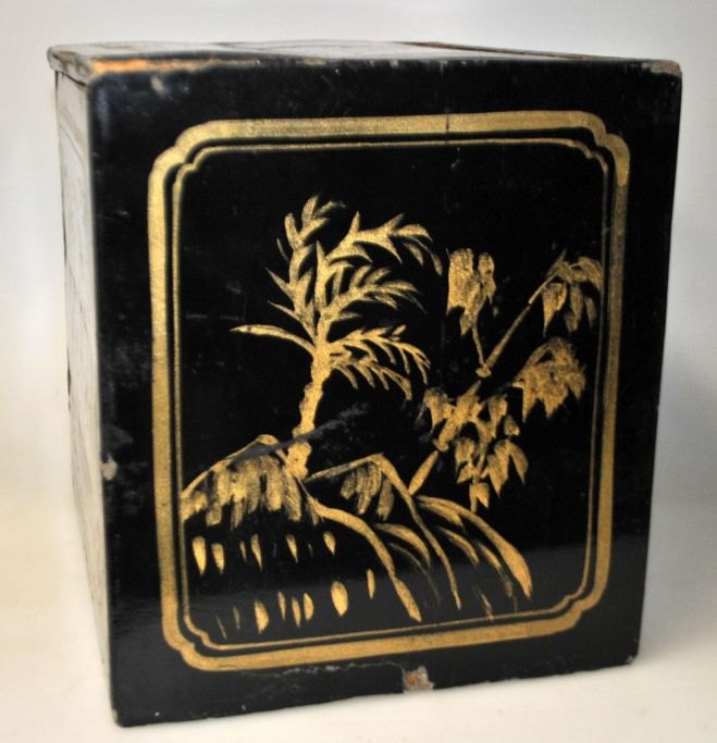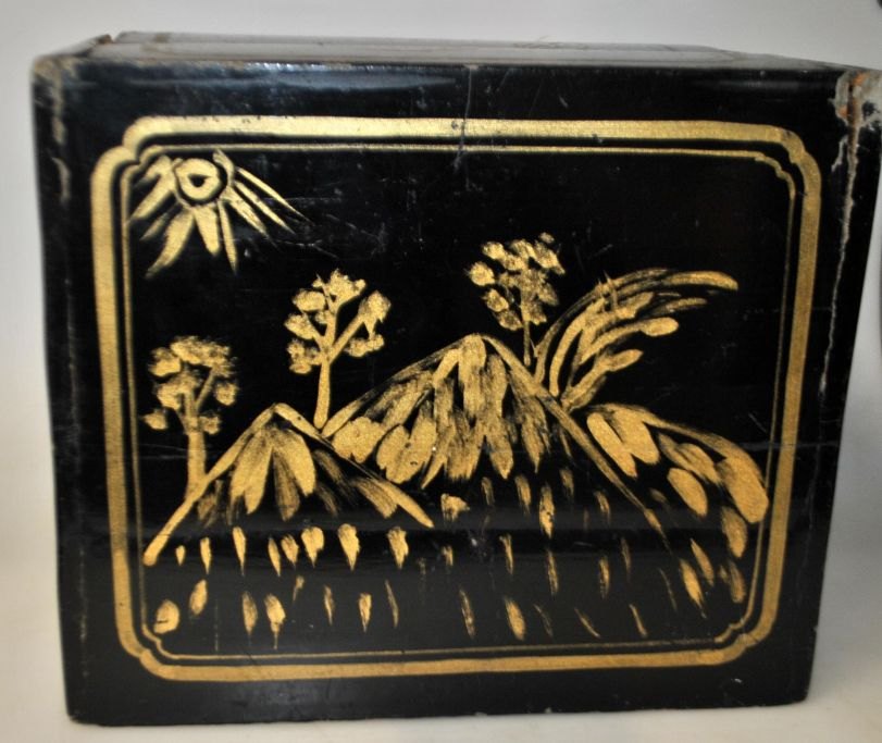 Antik bemalet trææske til te, Kina, 19. årh. Sortlakeret træ med dekorationer og tekst. 24 x 21 x 18 cm. Indvendig metal beholder med låg med tekst.