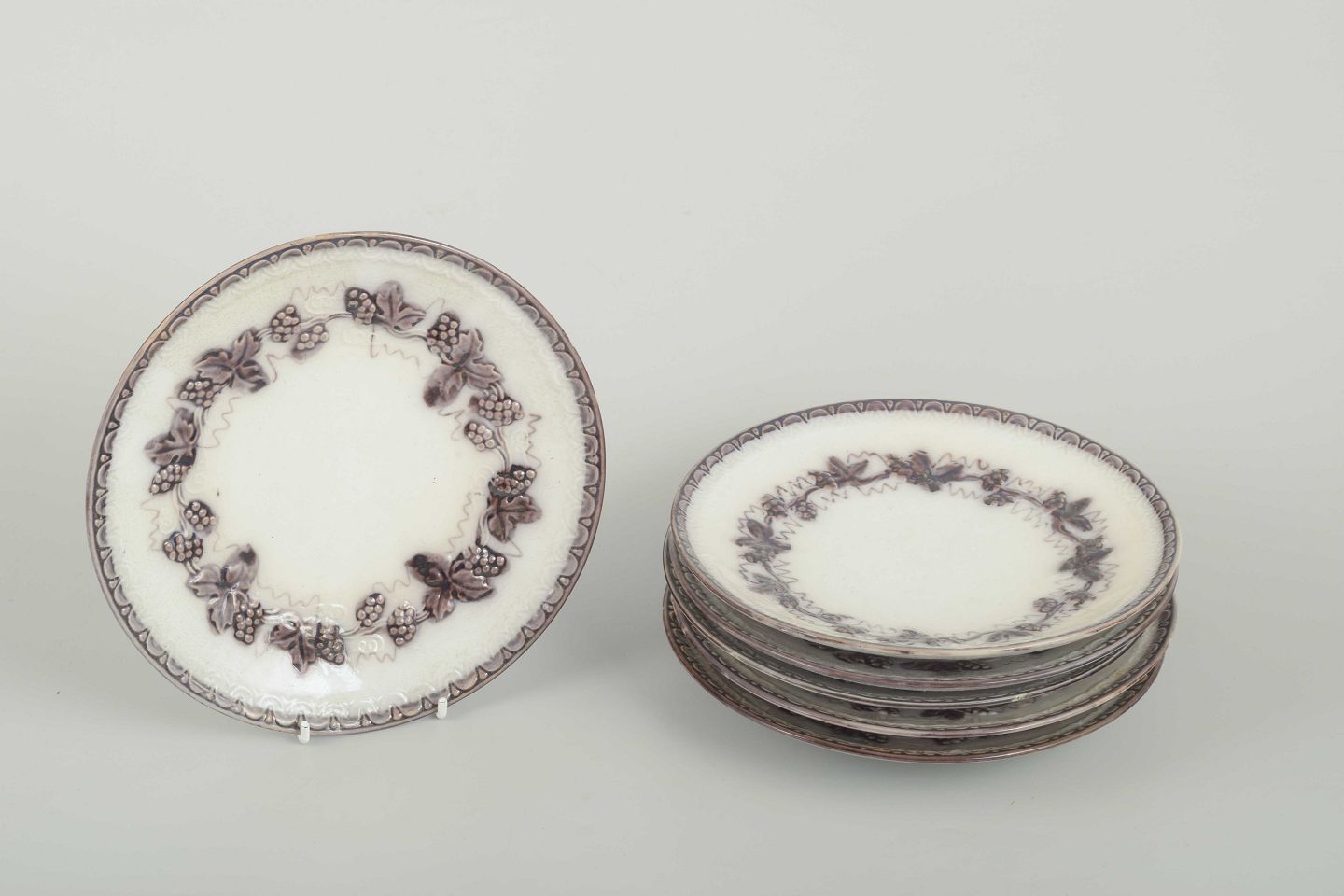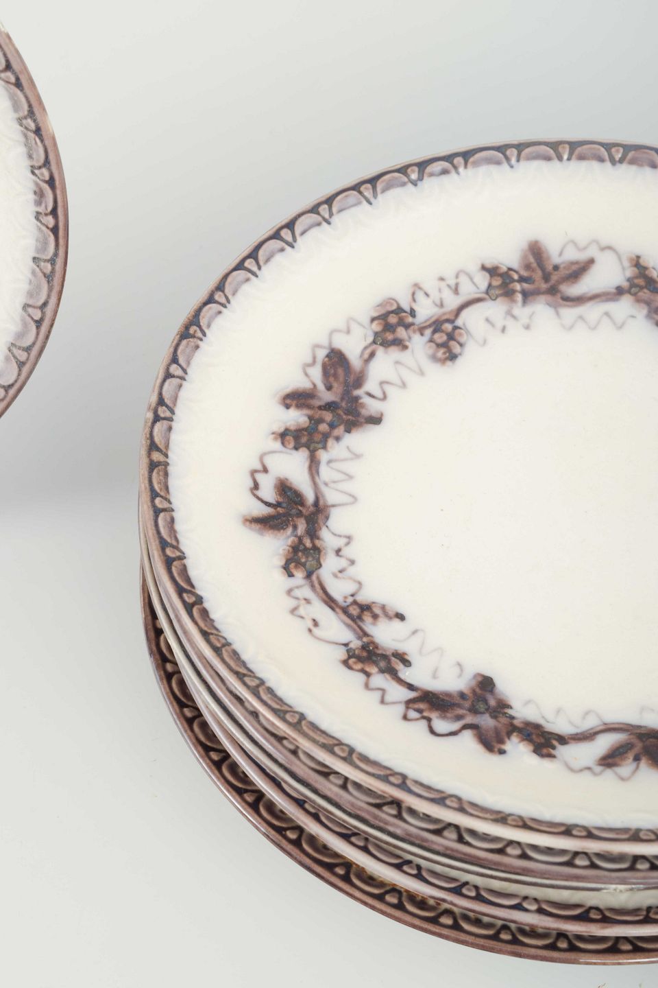 Sæt med 6 runde fajancetallerkener med reliefdekor og vinrankemotiv i brunlig tone langs randen.