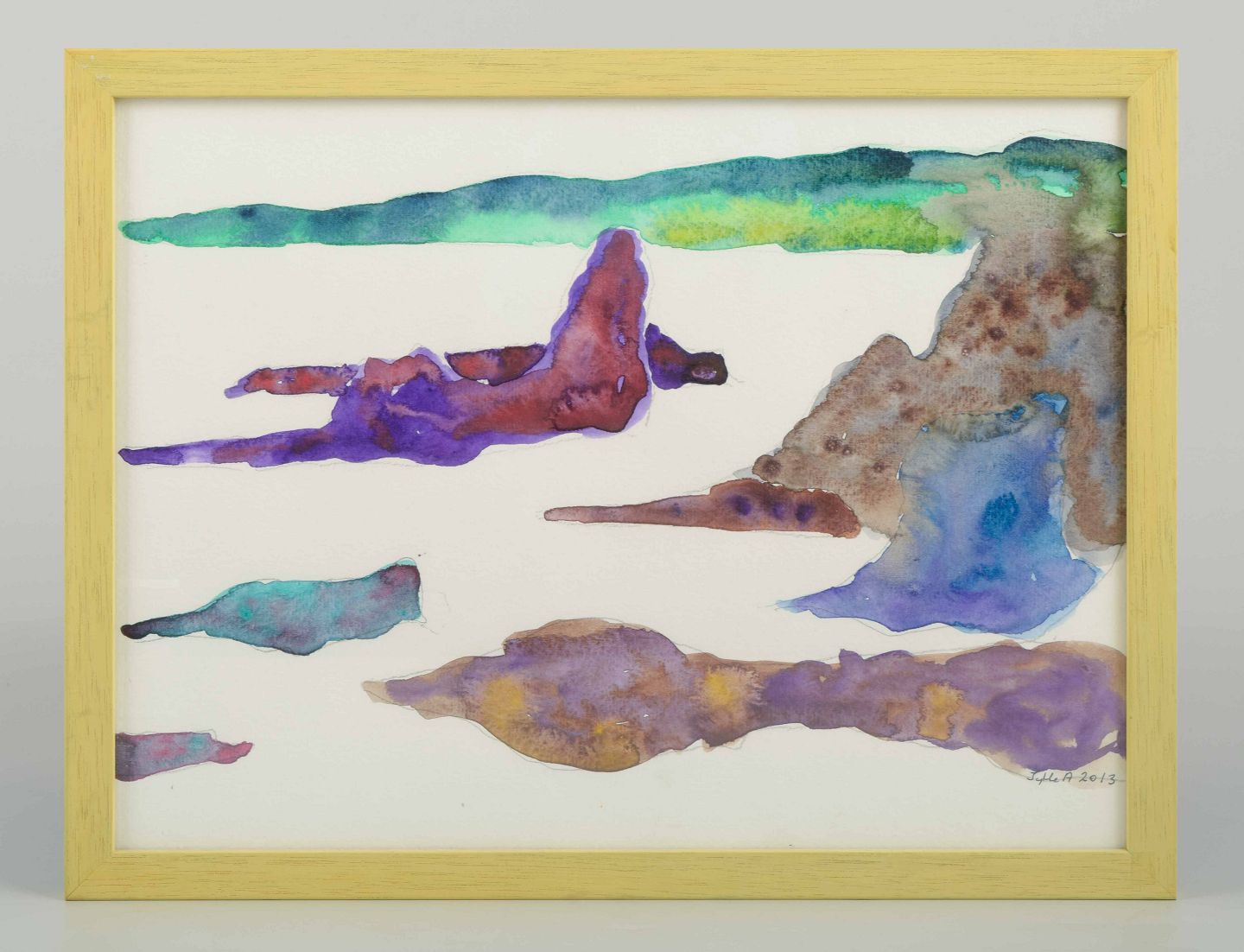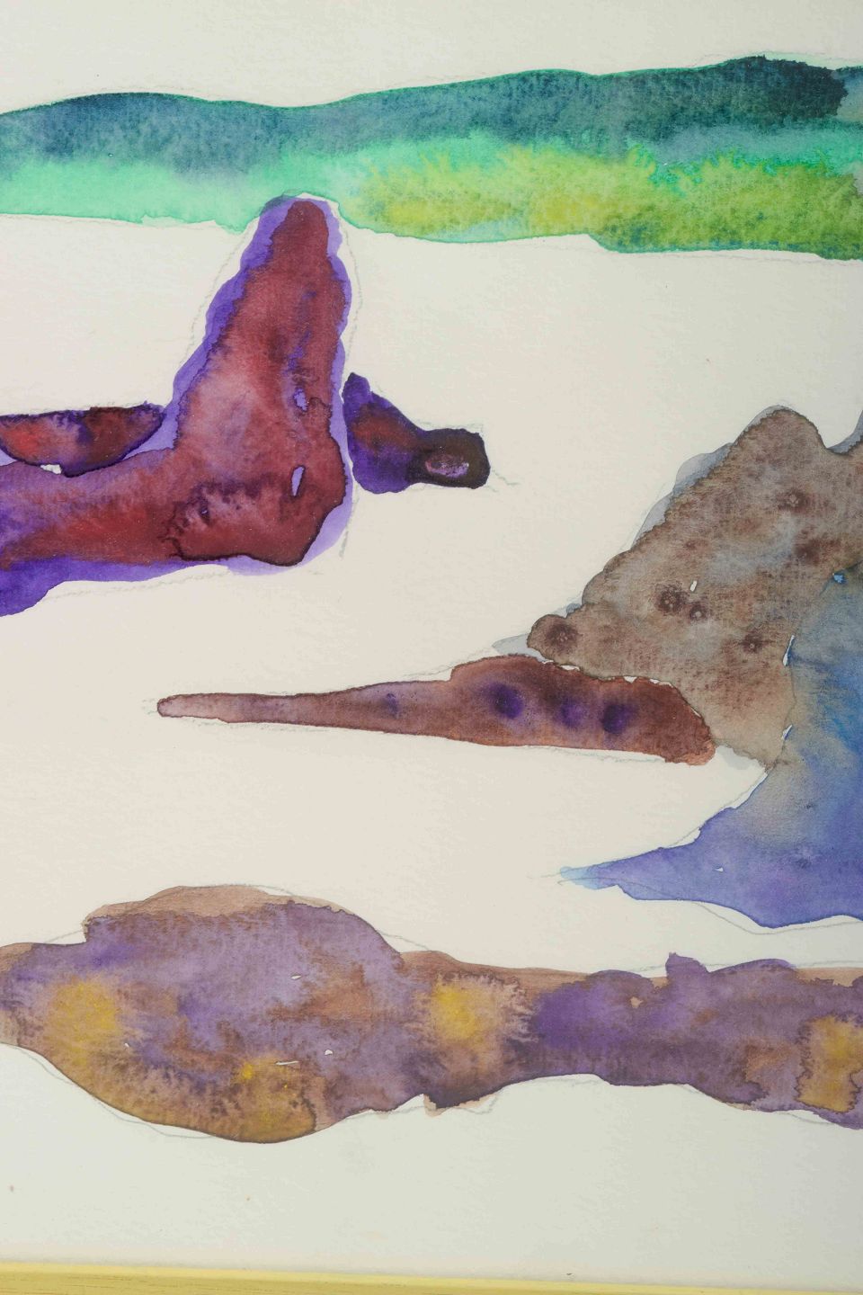 Et abstrakt og koloristisk værk udført i akvarel, hvor organiske former i violette, blå og grønne toner flyder over papirets hvide flade. Værket fremstår som en fri og eksperimenterende komposition med både figurative og naturinspirerede associationer.