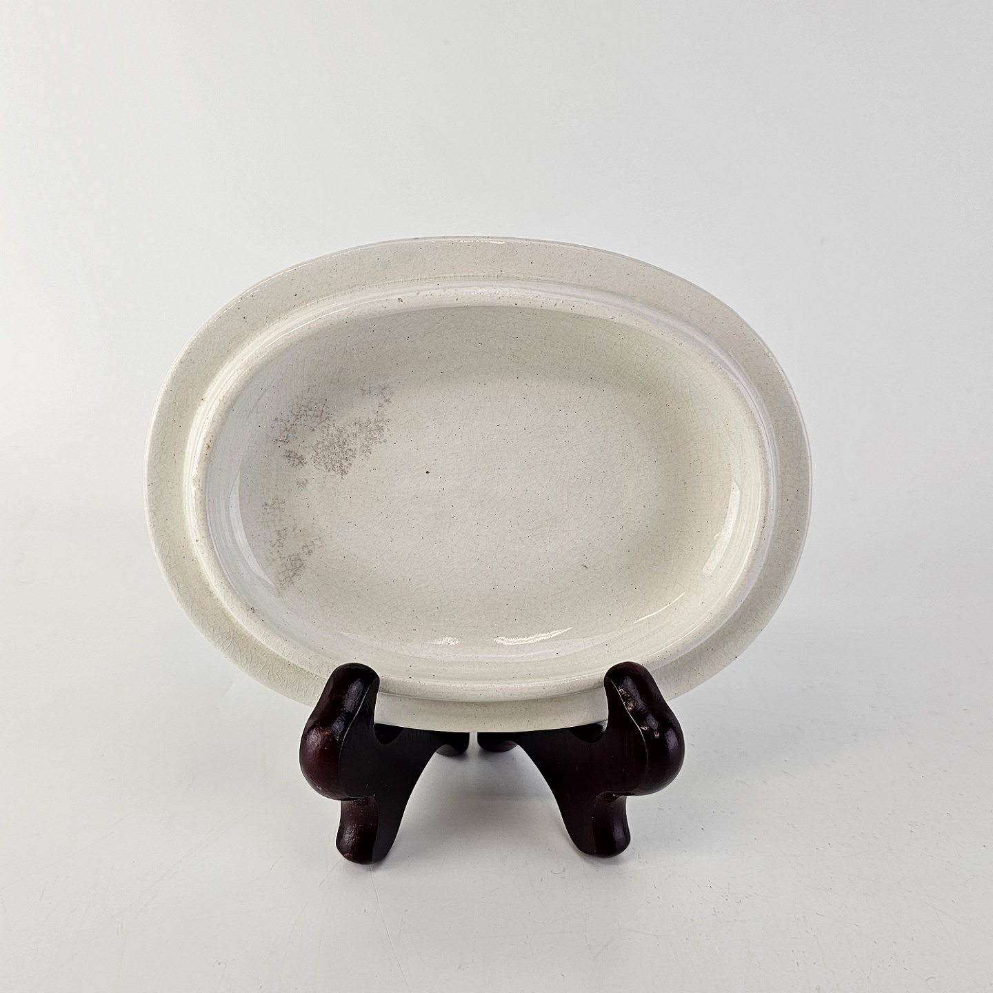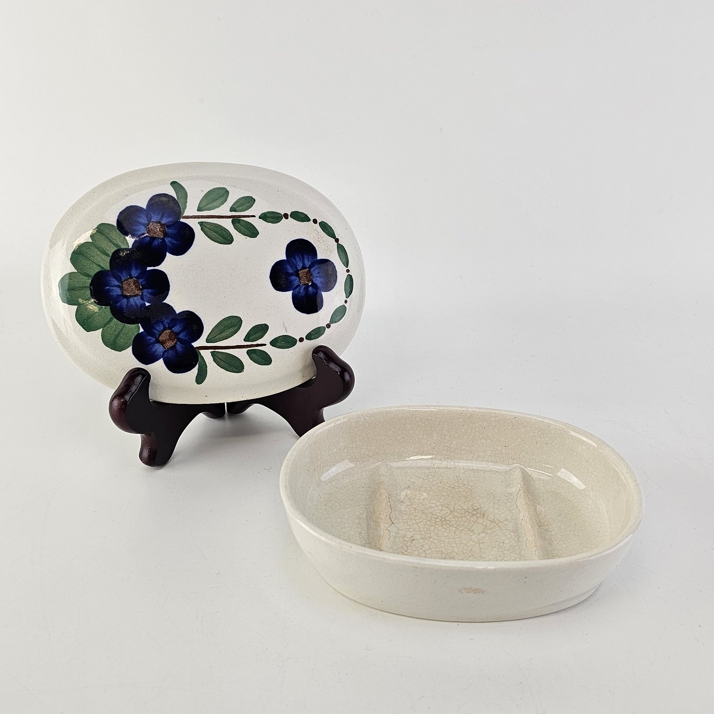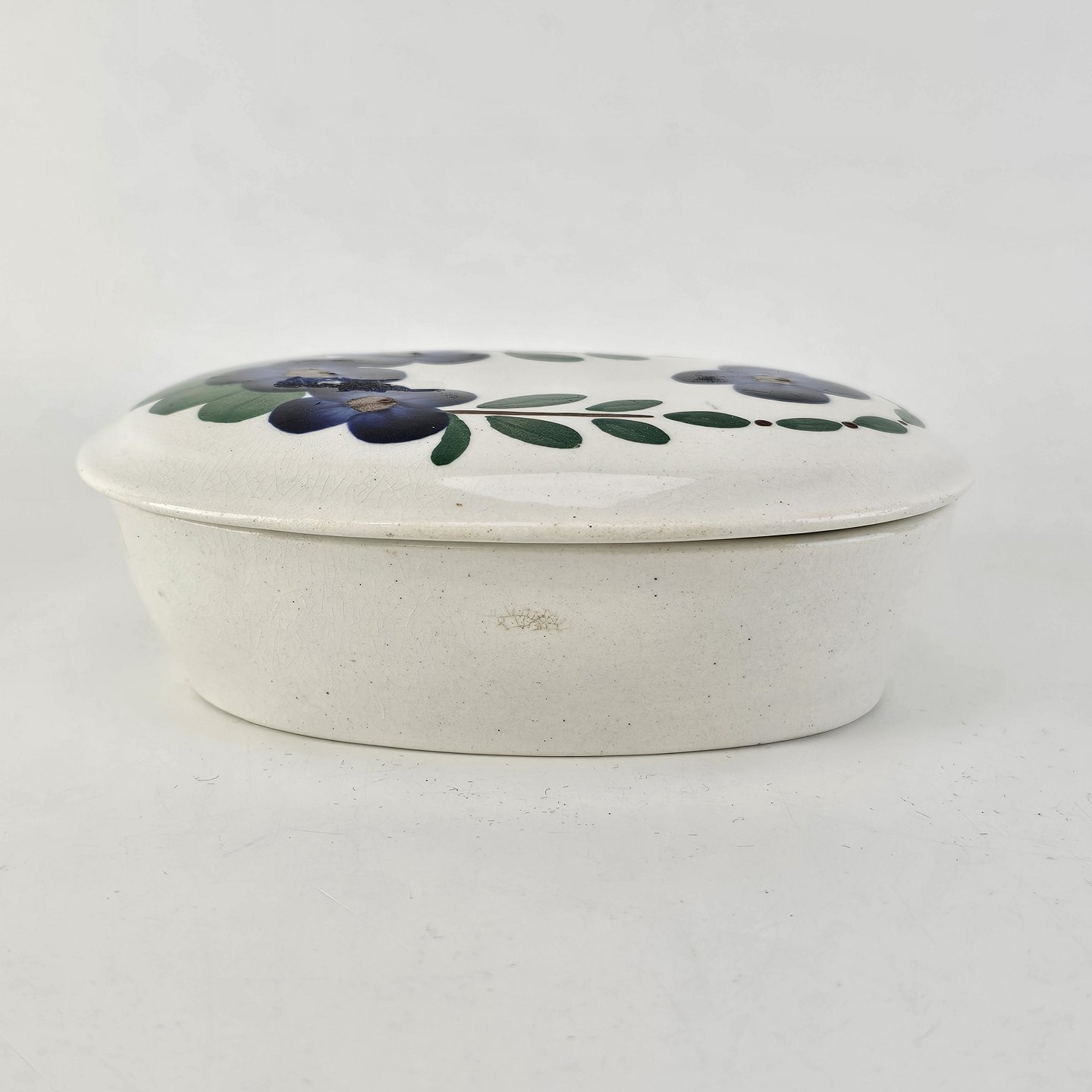 Sæbeskål af fajance med motiv af blå violer på låget fra stellet Viol III