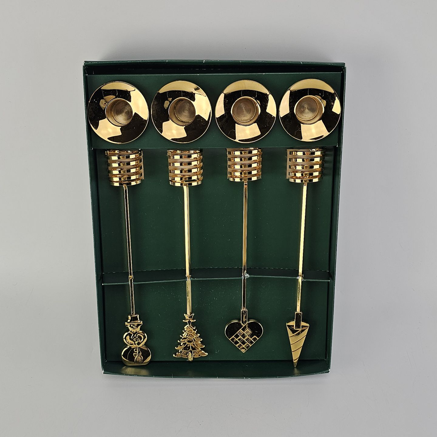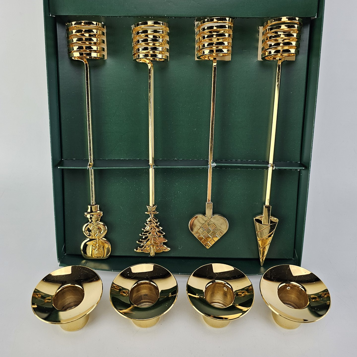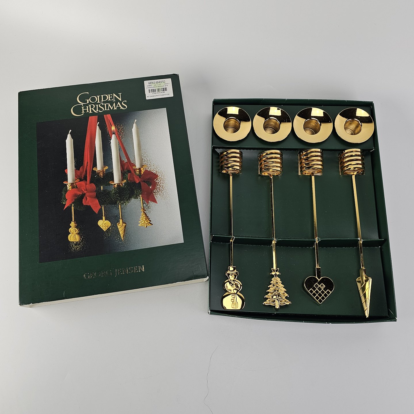 Sæt af fire guldbelagte lysholdere til adventskrans fra serien Golden Christmas i original kasse