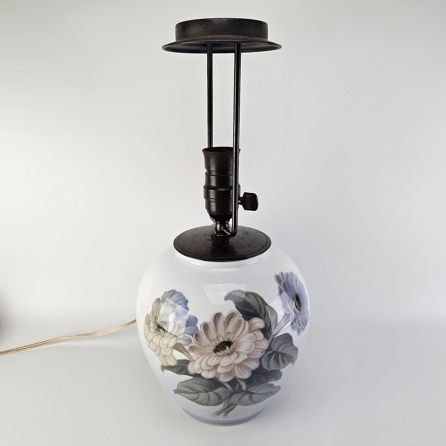 Bordlampe i hvidt porcelæn med dekoration af blomster og sommerfugle, og fatning i sort metal