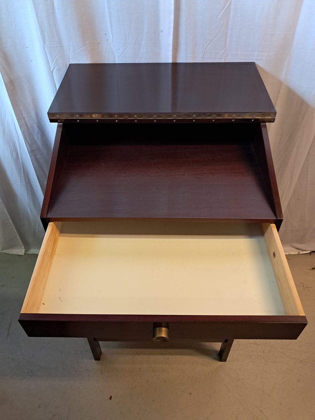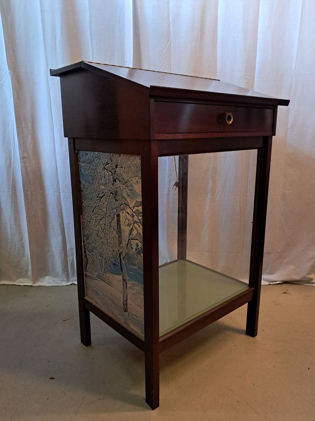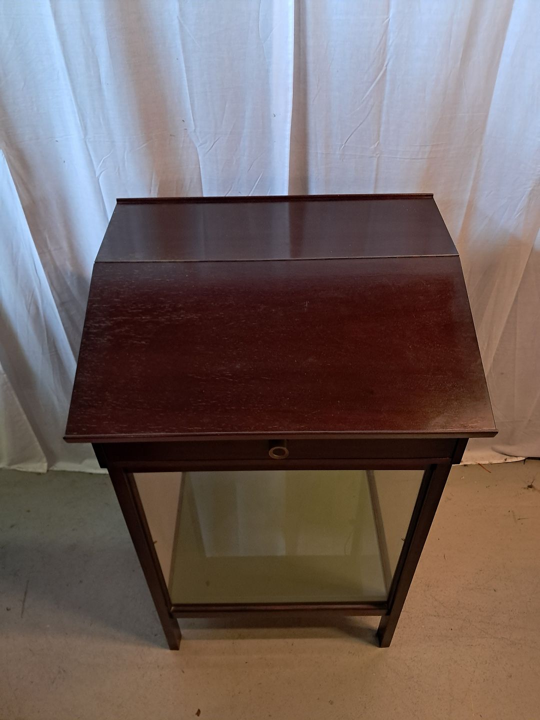 Skrivepult i fineret mahogni og glas, fra 1980erne.