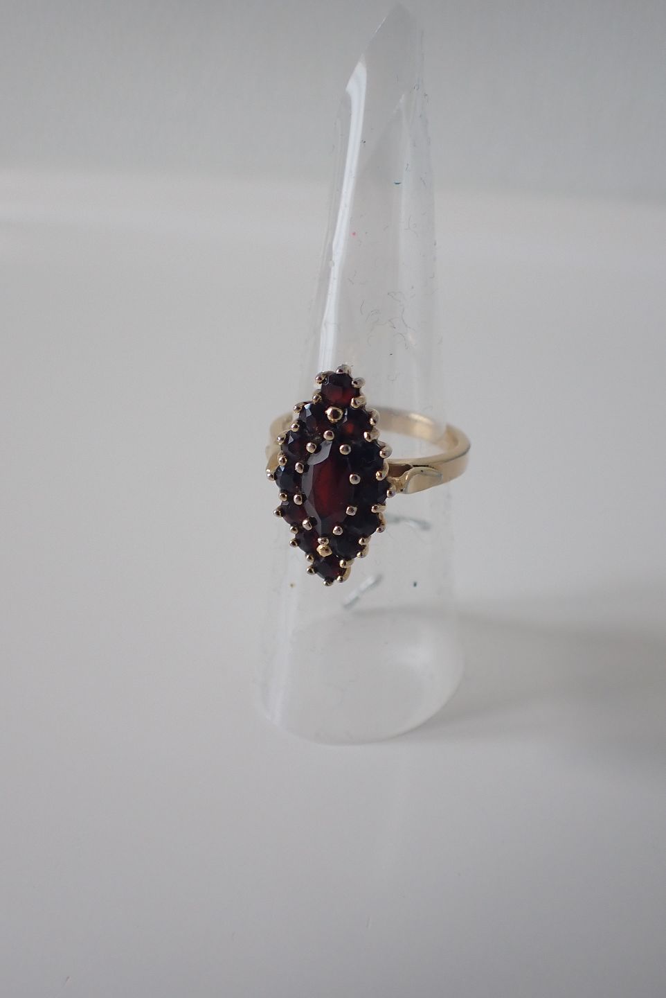 Forgyldt sterling sølvring med 12 små granater og en større sat i rombeform. Dansk. stemplet 925.Ca. 1990. Mål på romben: 2,1 x 1,2 cm. Ringskinnebredde: 0,3 cm. I fin stand.