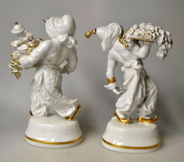 Tutter, Karl (1883 - 1969) Tyskland: To figurer af blanc de chine med guldstafferinger i form af mandefigurer bærende på hhv. et frugtfad og en vinkande. Betegnet K. Tutter. Hutschenreuther, Selb-Bavaria, Abteilung für Kunst. H. 21 og 22.