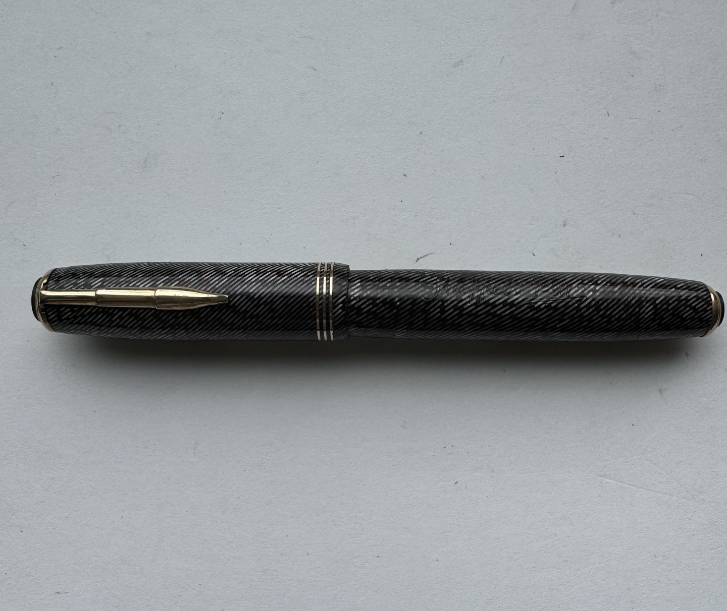 Sølv og grøn spiralstribet Sheffield Pen fyldepen fremstillet i 1940’erne. Spidsen er en 14 karat guldstoles fra Oxford. Muligvis et dansk produkt. Har F.eks. Lighed med fyldepenne fremstillet hos Penol. Fremstår i god stand. Fungerer ikke. Der skal indsættes ny gummisæk før end pennen kan optage blæk og skrive igen. Ny gummisæk kan indsættes mod et tillæg på kr. 250,- til fyldepennens pris. Mål: 12,2 cm