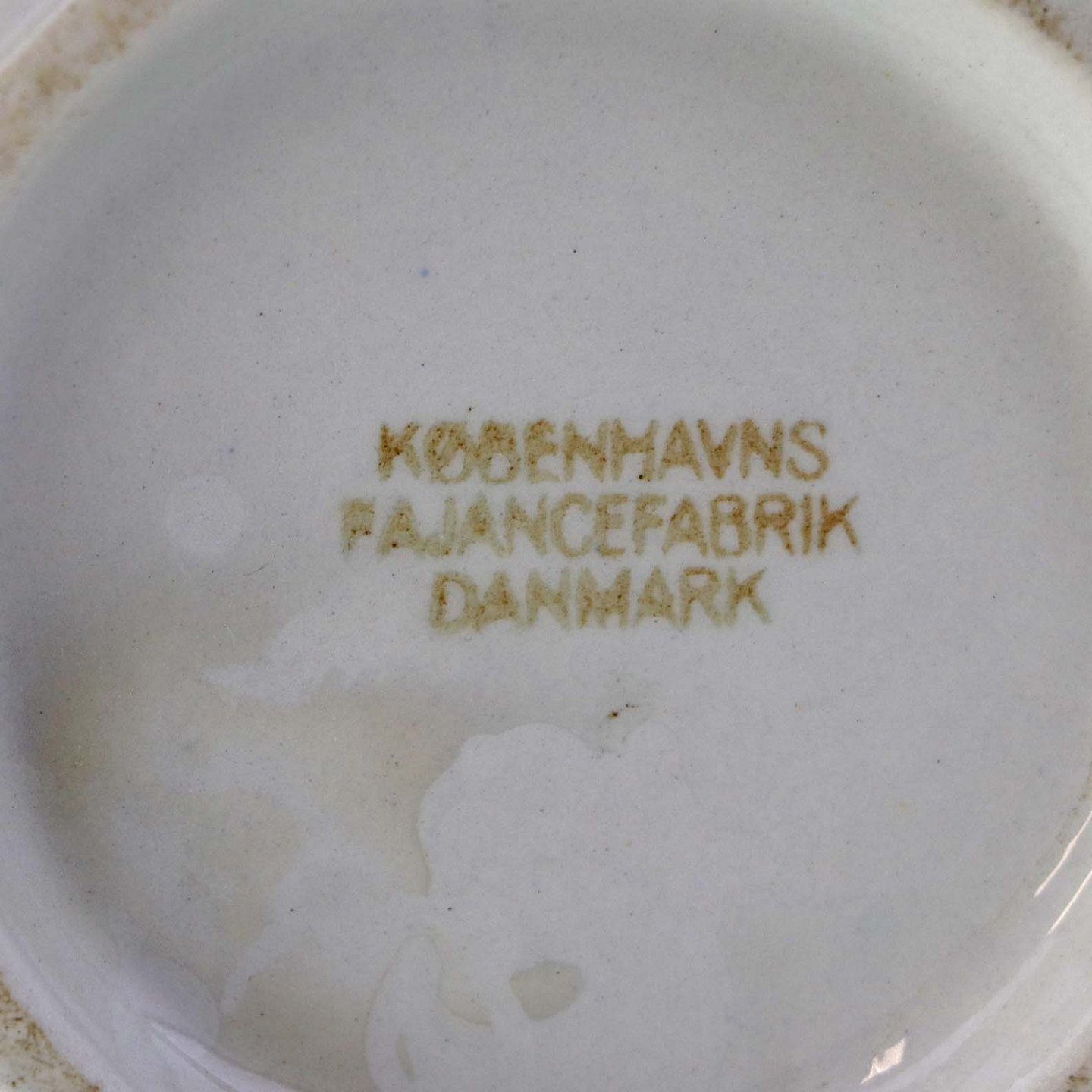 Fremstår med indvendige brugsspor, mindre slid på glasuren på tuden, utydelig grønlig streg under glasuren på låget, ujævnhed i topkanten og brugsspor under bunden.