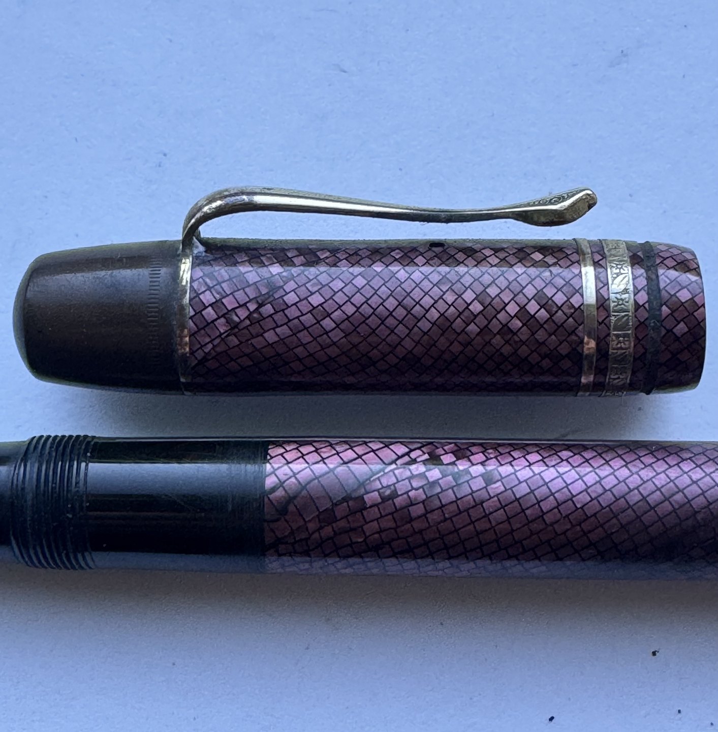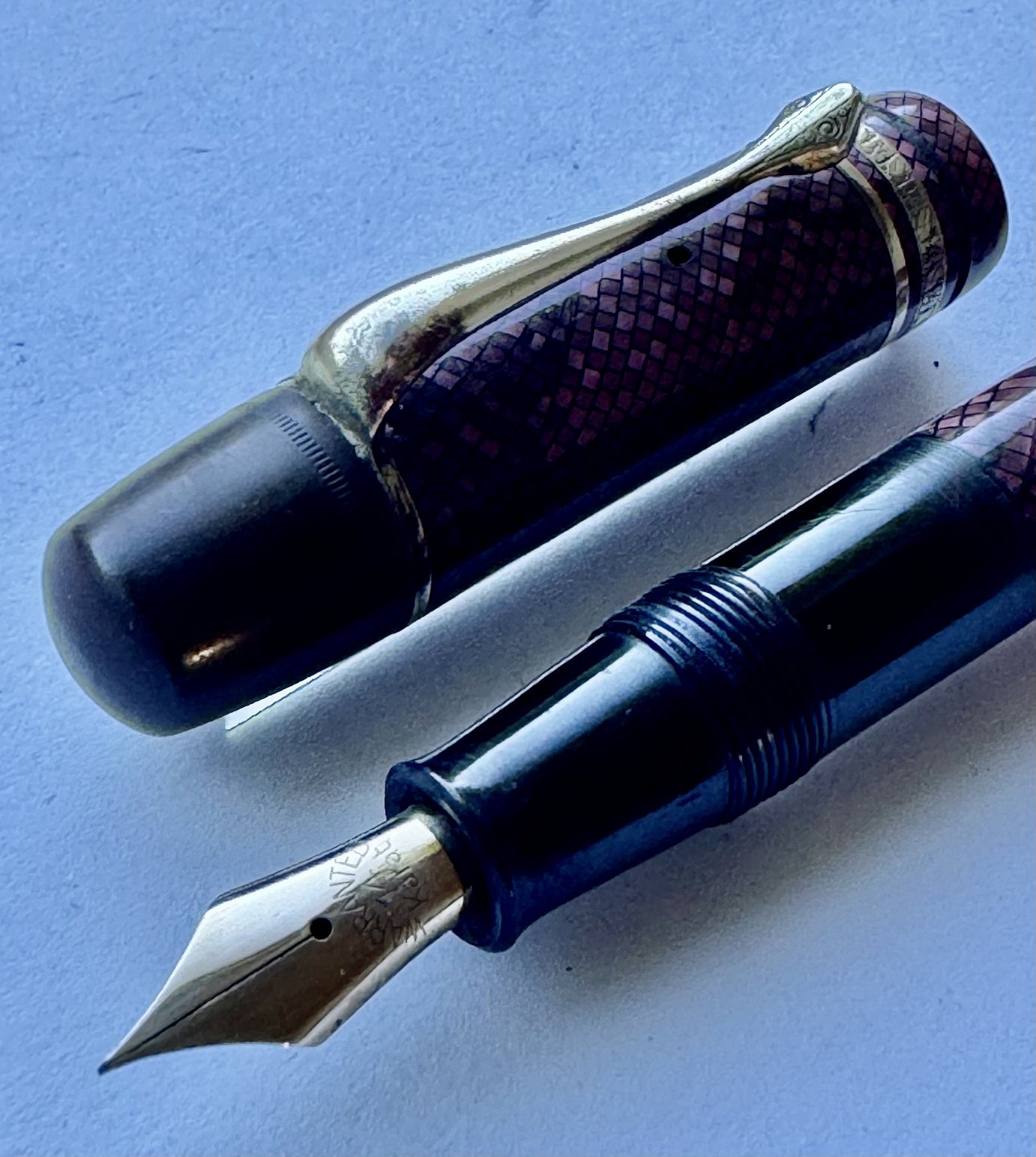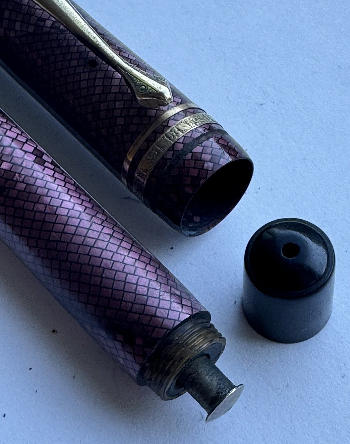 ART DECO STIL: Bordeaux slangeskind fyldepen fra omkring 1940. Fremstår i god stand uden skader eller reparationer. “Push button” blæk-påfylder. Fungerer ikke. Der skal isættes ny gummisæk før end den er funktionsdygtig igen. Ny gummisæk isættes mod en betaling på kr. 250,- Denne fyldepen er 12,5 cm lang.