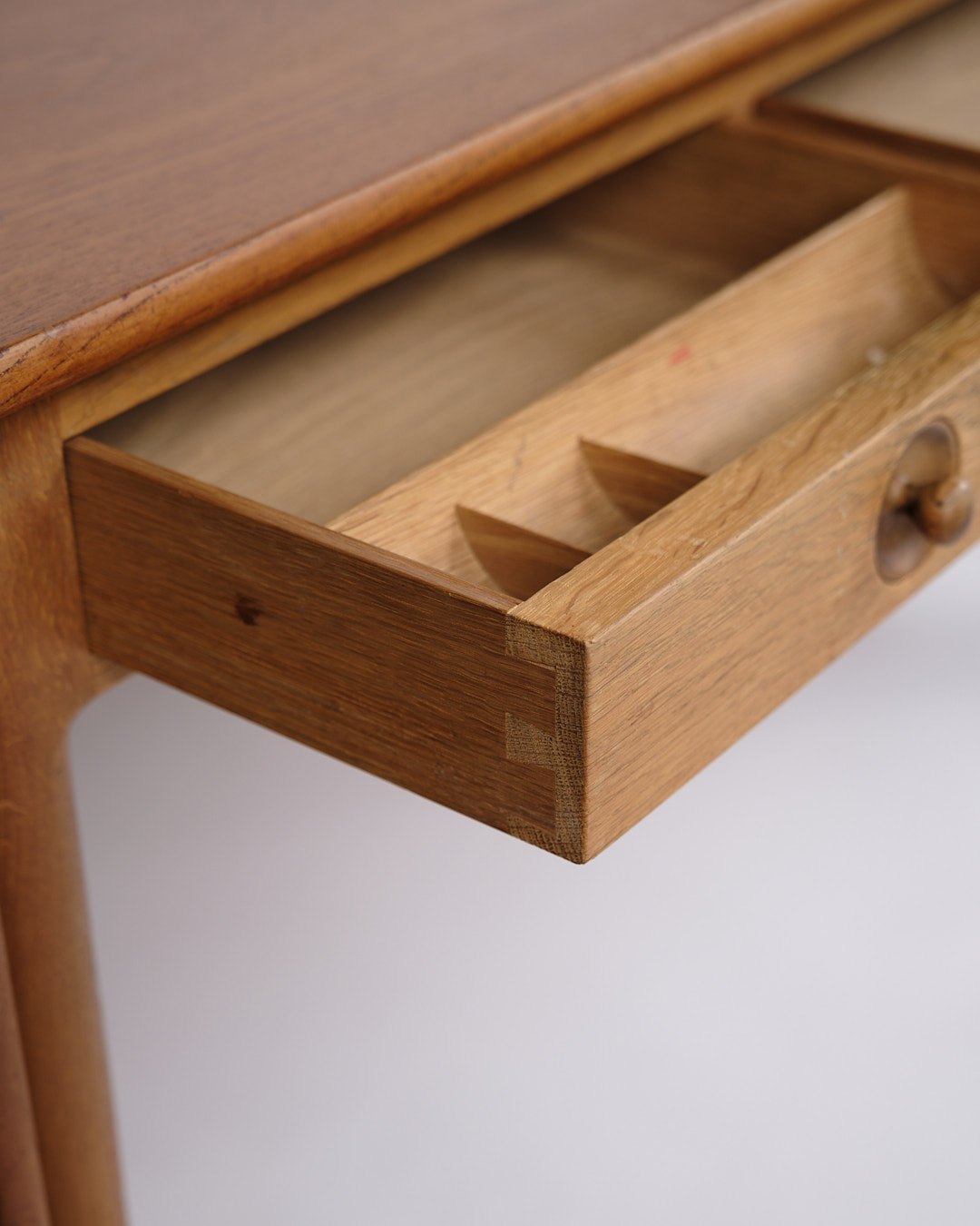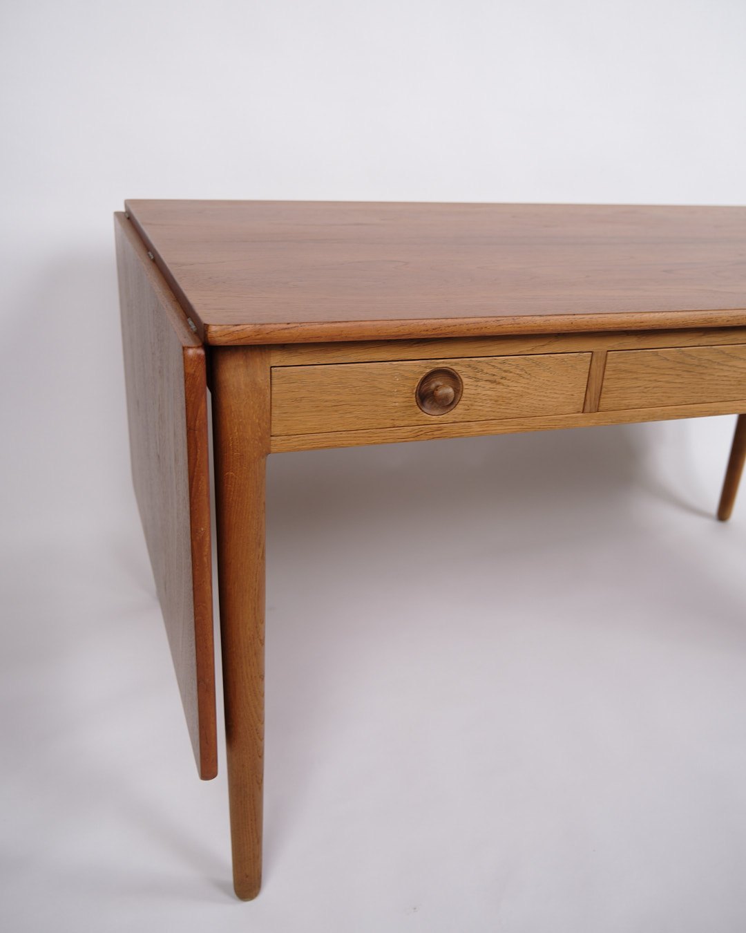 Skrivebord med klapper, model AT-305, designet af Hans J. Wegner og produceret af Andreas Tuck i 1950’erne. Bordet er udført i teak med ben i eg og kan udvides fra 135 cm til hele 229 cm ved hjælp af to klapper, hvilket gør det både funktionelt og fleksibelt.