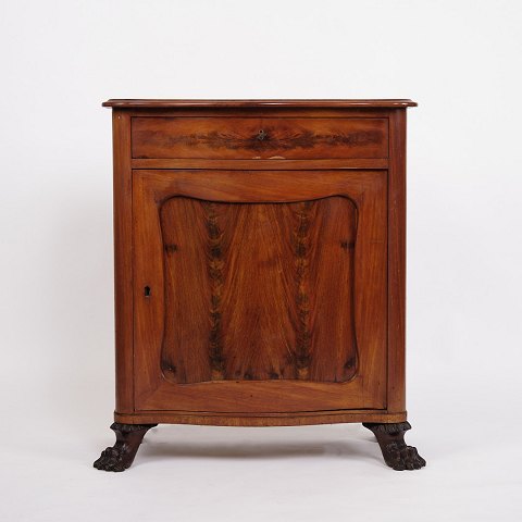 Lille konsol-/entrémøbel fra 1890’erne, udført i håndpoleret mahogni med flamme struktur. Skabet står på detaljerede løvefødder, der giver et elegant og klassisk udtryk.