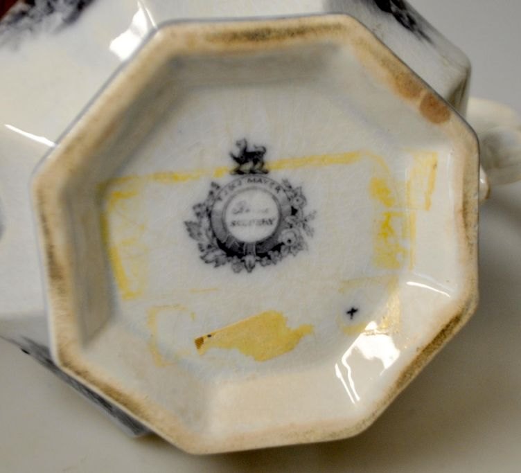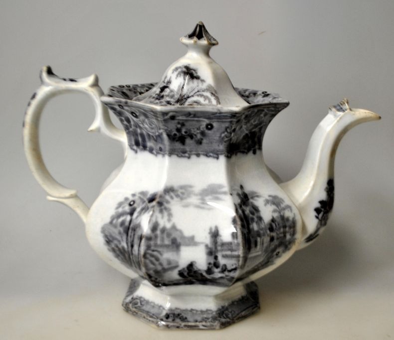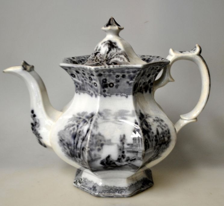 Engelsk fajance kaffekande, ca. 1850. Blue transferware. Mayer Staffordshire. 8 kantet korpus med låg, hank og tud. Dekoreret med klassisk sceneri med mennesker i en båd på en sø. Stemplet. H.: 22 cm. L.: 27 cm.
