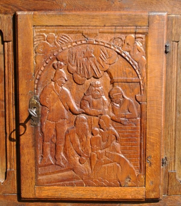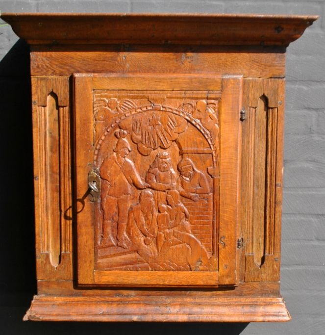 Antikt dansk barokt hængeskab i egetræ, 1700-tallet midte. Med antik lås og nøgle. Frontlåge med udskæring af De hellige Tre konger. Indvendig med to hylder og en skehylde foroven. H.: 70 cm., B.: 61 cm. D: 26 cm.