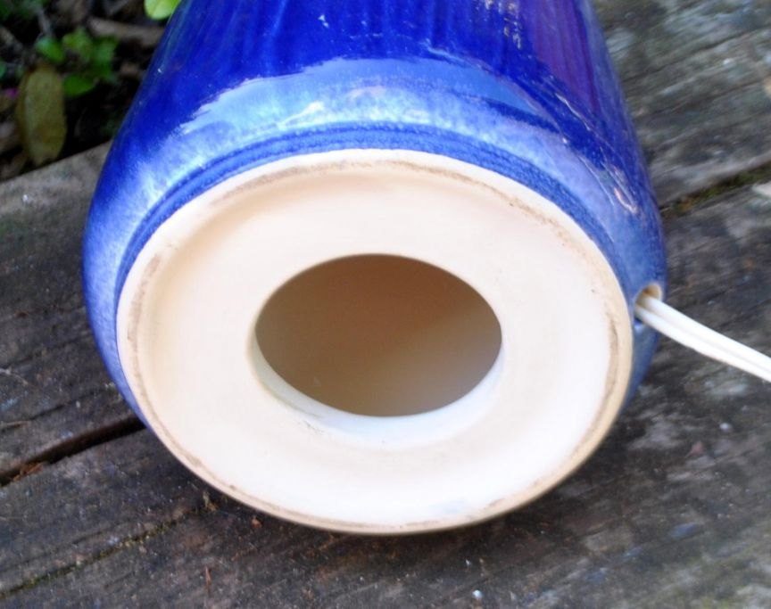 Keramisk bordlampe med blå glasur, 20. årh. Danmark. Med kanneleringer. Ustempelet. Højde uden el montering: 37 cm. Med elmontering: 58 cm. I lampe boret hul til ledning.