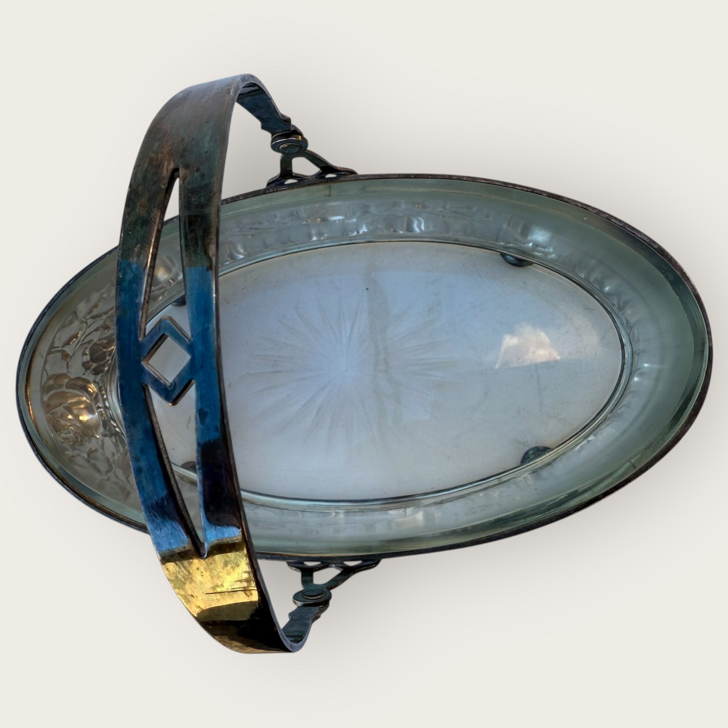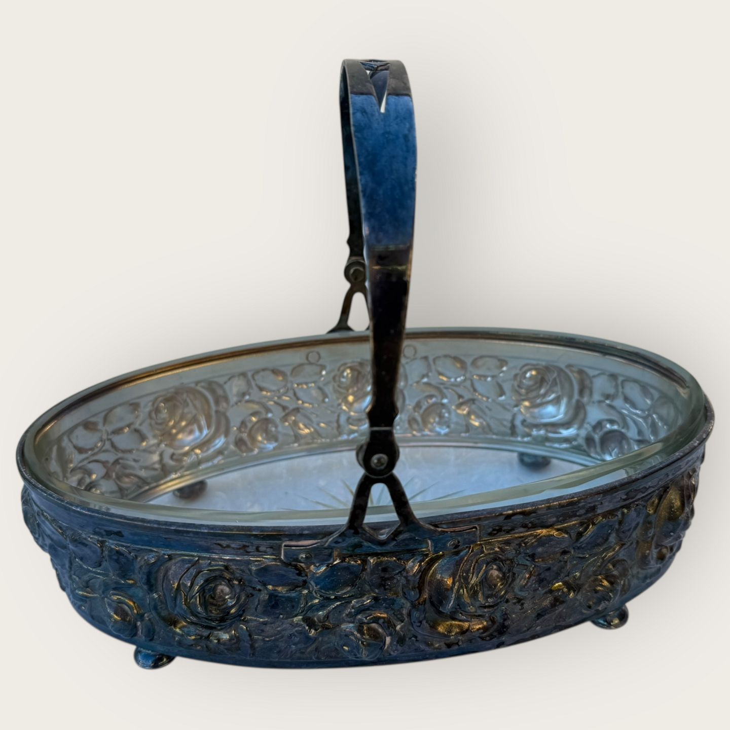 Skål med glasindsats i sølvplet med udsmykning af roser og med hank, 25x14cm. *Flot patineret stand, med hel glasskål*