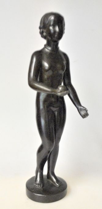 Andersen, Just (1884 - 1943) Danmark: Figur, Ydun. No. D 2307. Patineret discometal. Signeret. H: 29 cm. 1, gang produceret 1942. Ifølge nordisk mytologi var hun gudinde for evig ungdom og vogter af de foryngede gyldne æbler. Perfekt stand!