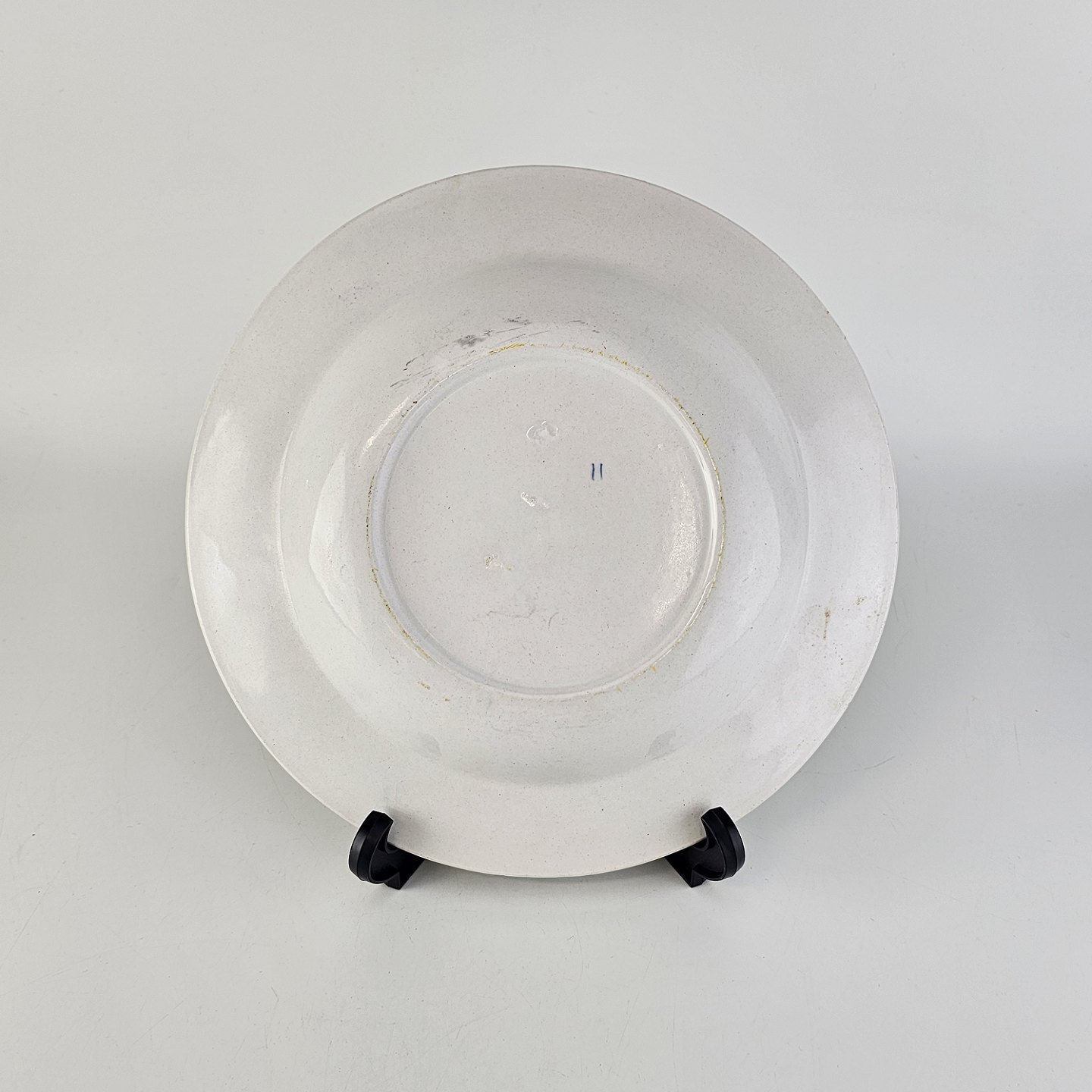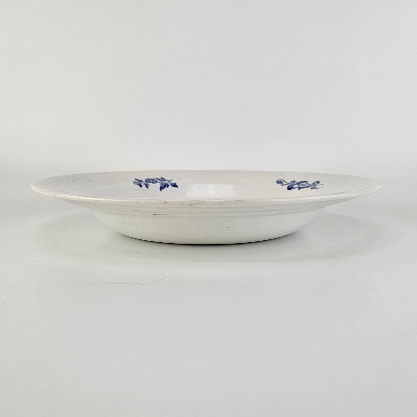 Stel i glat hvid fajance med dekoration af blå blomster og flettet kant