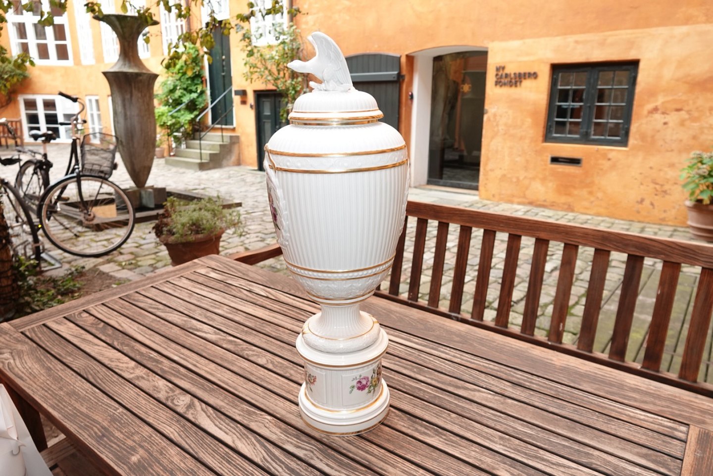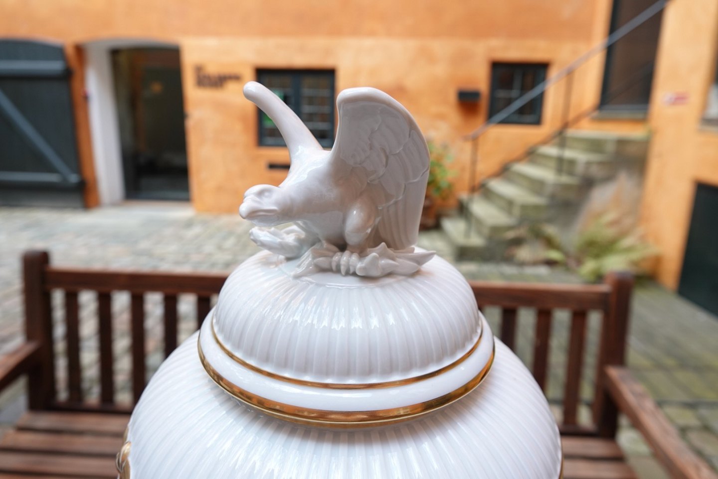 Royal Copenhagen kæmpe lågkrukke med ørn på toppen.