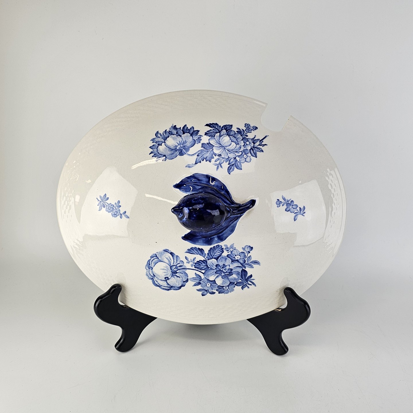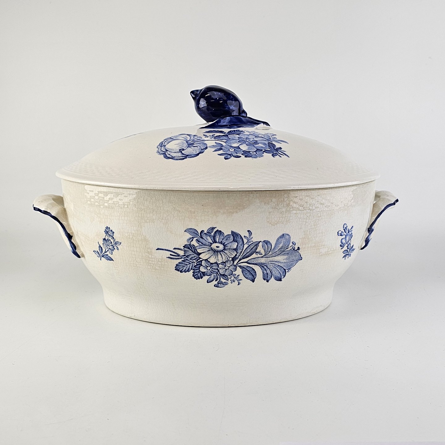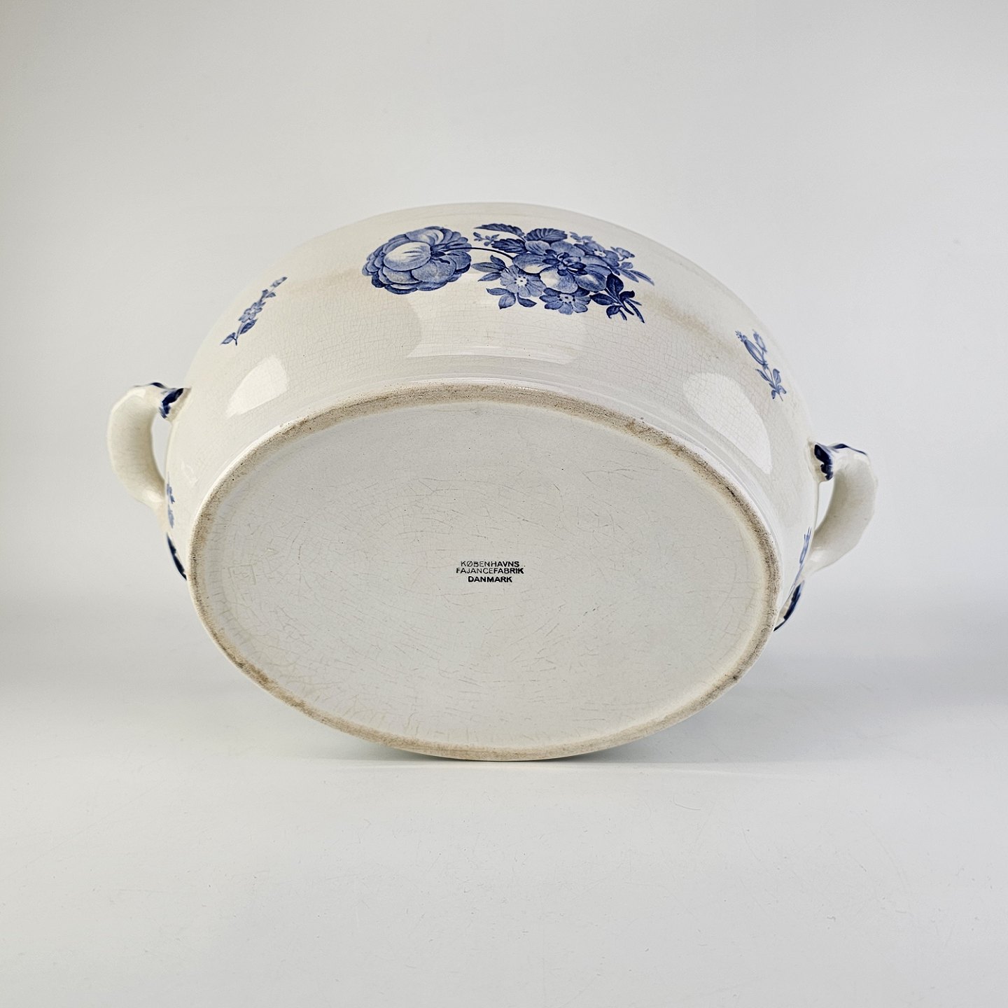 Stel i glat hvid fajance med dekoration af blå blomster og flettet kant