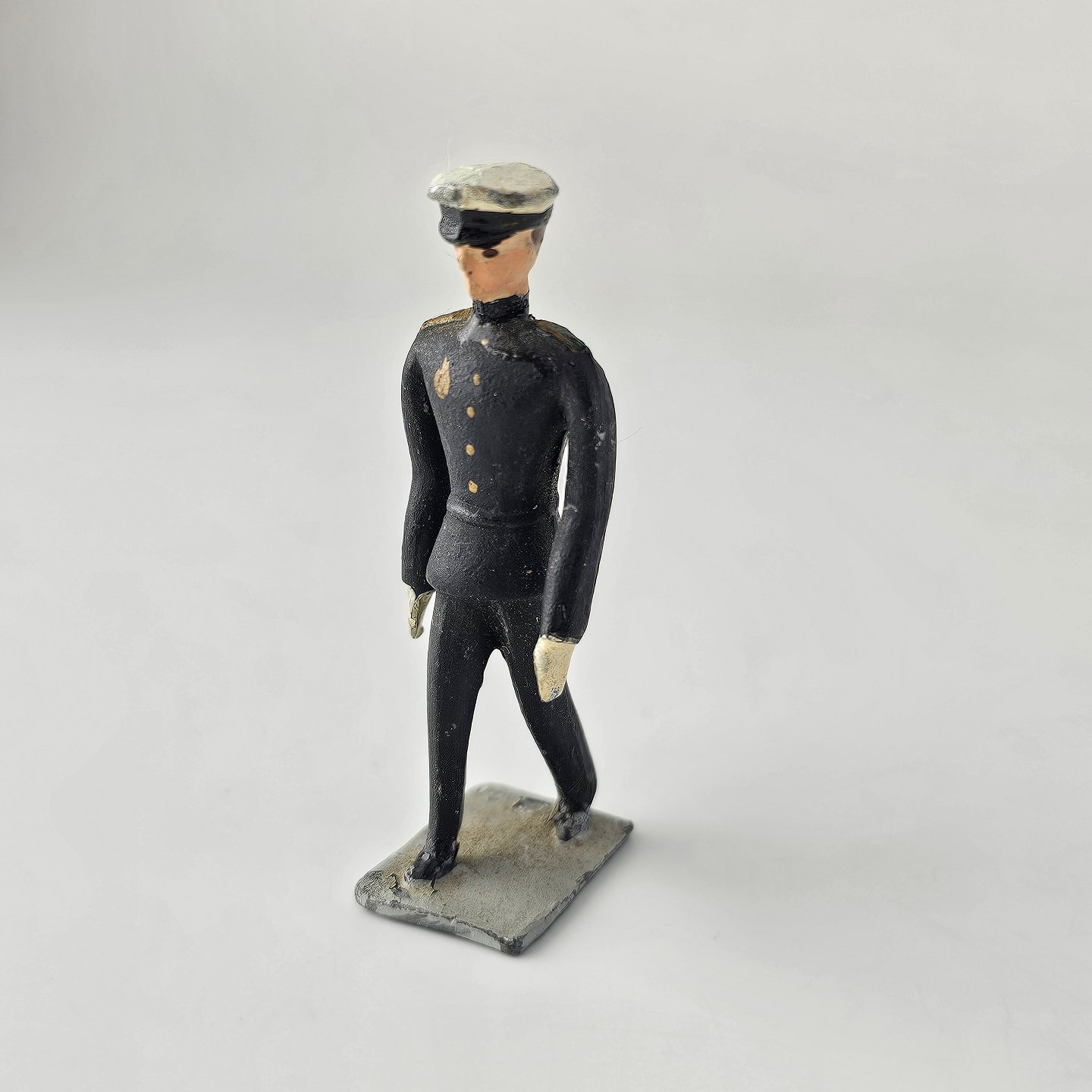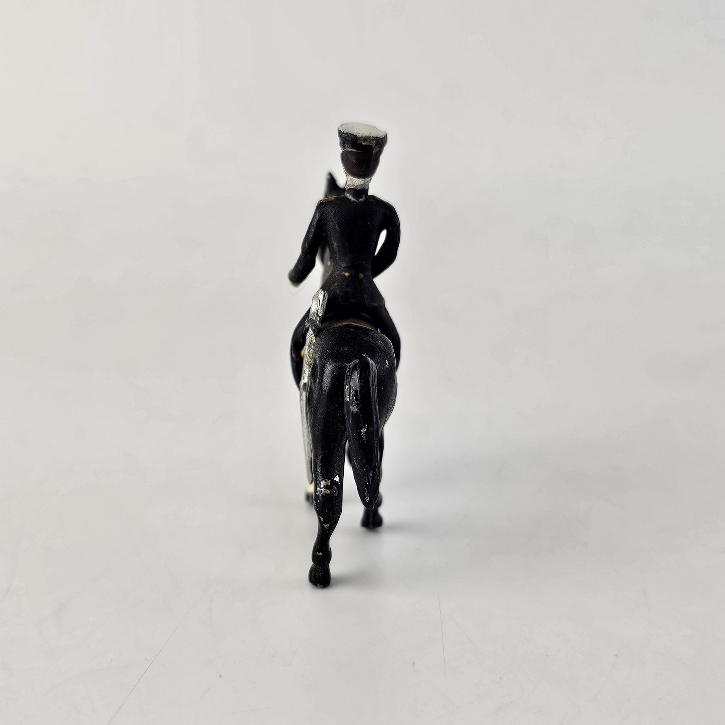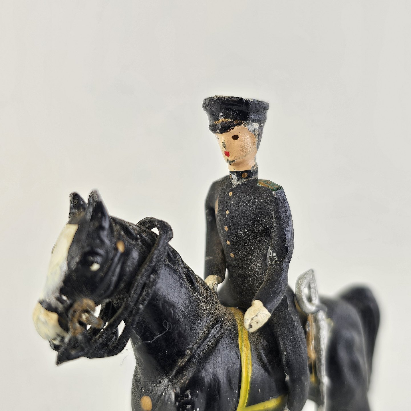 Fem figurer af politifolk i tin, én stående og fire til hest