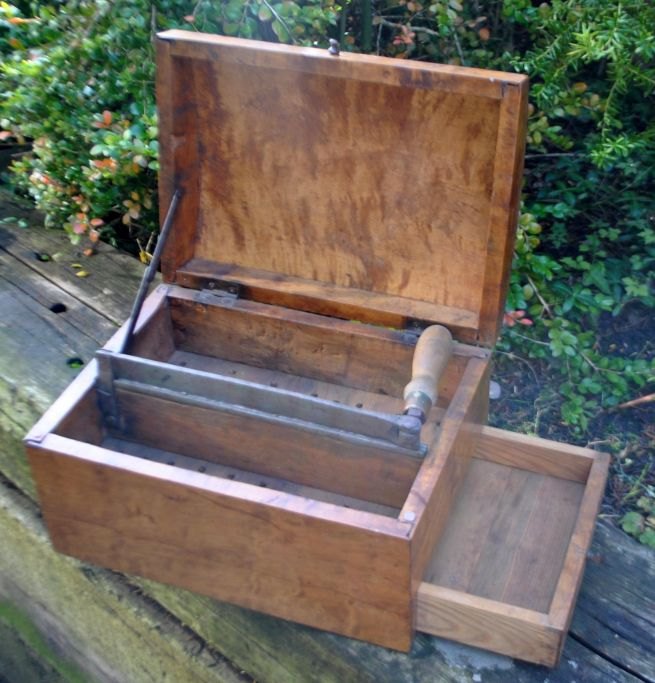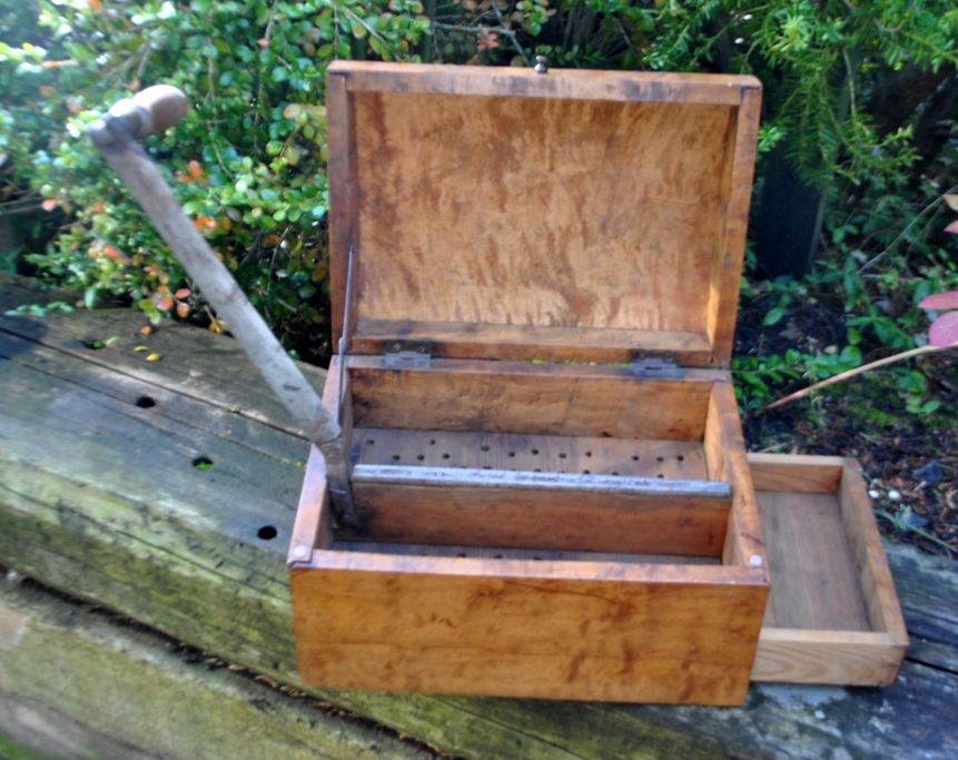 Sukkerkasse i birketræ, 19. årh. Sverige. Med kurvet låg, huggekniv, perforeret bund og skuffe. H: 19 cm. B: 33 cm. D: 24 cm.