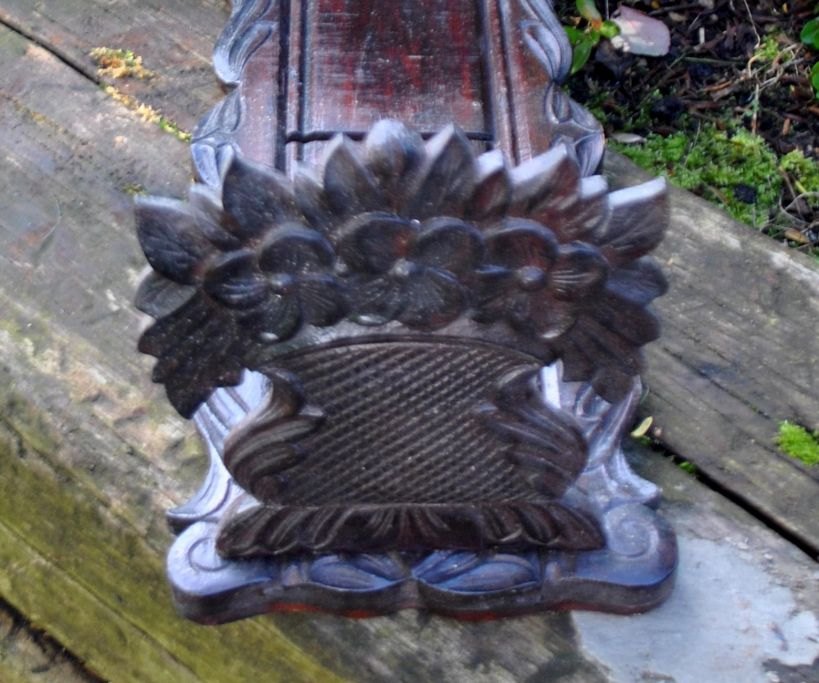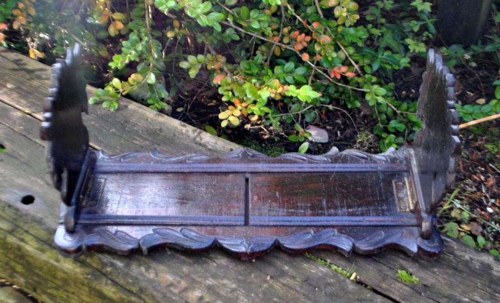 Antik rejse bogreol. 19. årh. Antagelig Tyskland. Med udskæringer i form af kurve med blomster som endestykker. H.: 21 cm. Længde samlet: 44 cm. LÆngde udtrukket: 83 cm.