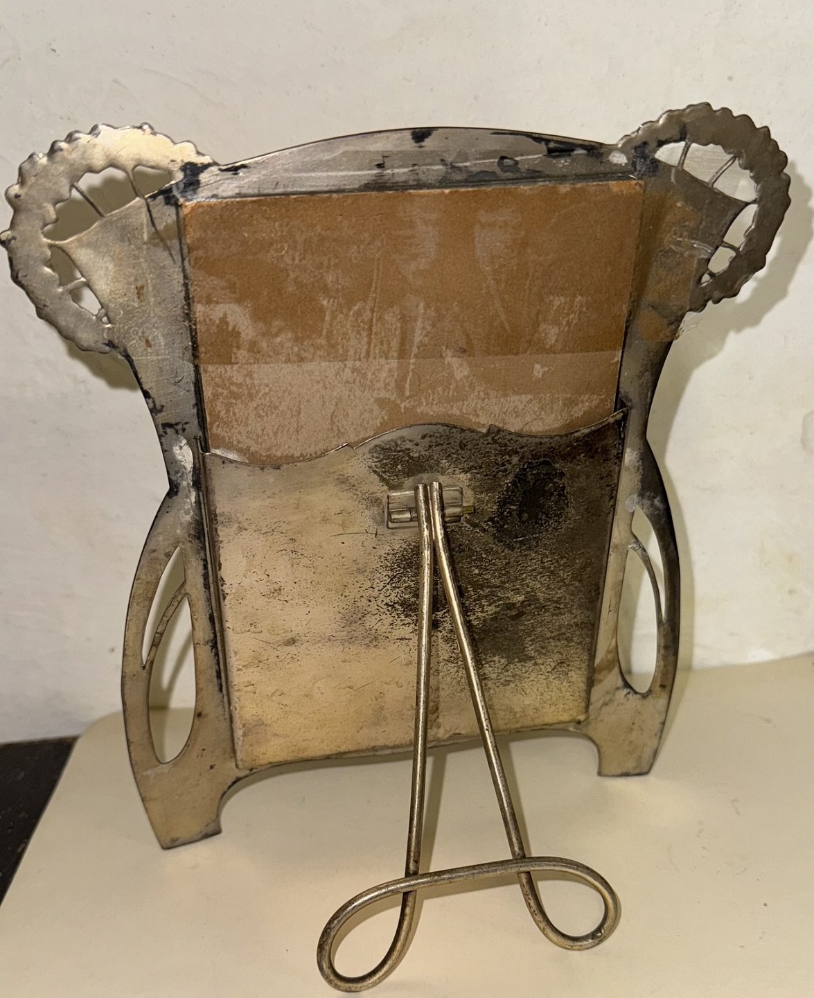 Foto billede ramme i metal og glas. Rammen udført i Art Nouveau stil. Fremstillet omkring 1910. I god stand med almindeligt brugsslid. Ingen skader eller reparationer. Mærket med et W på bagsiden. Fotografiet følger ikke med. Mål: H. 21,5 cm B. 17,5 cm