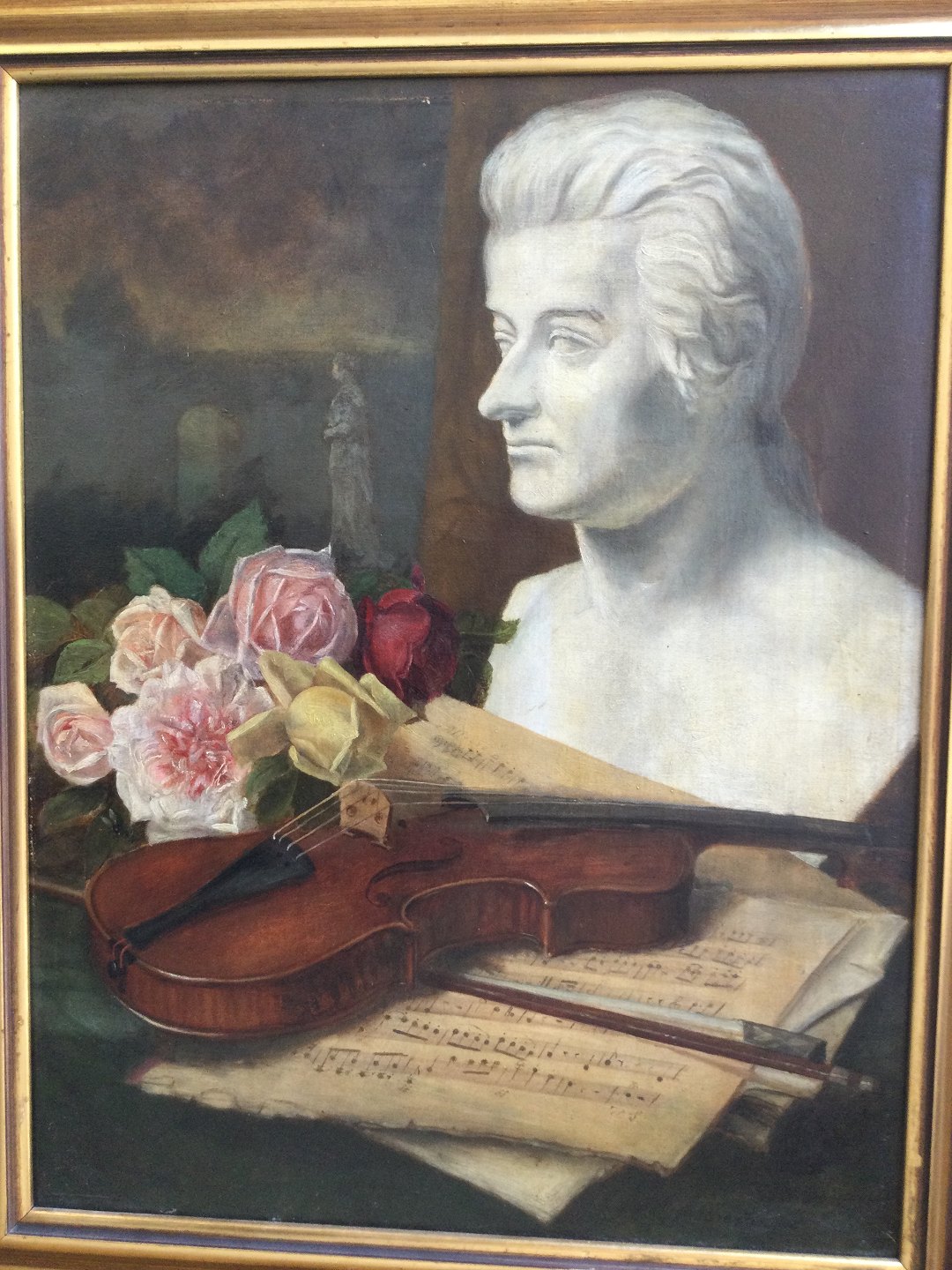 Opstilling på bord med violin, partitur, rosenbuket og buste.