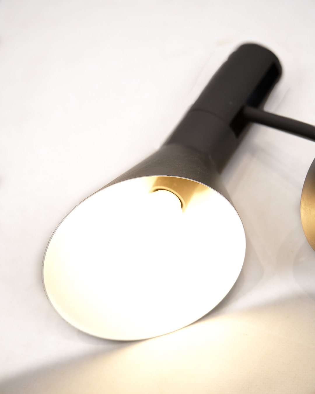 Sæt af to AJ væglamper i lys grå, designet af Arne Jacobsen i 1960’erne og produceret af Louis Poulsen. Lamperne er udført i pulverlakeret stål og har det karakteristiske skærmformede design, der giver både direkte og retningsbestemt lys.