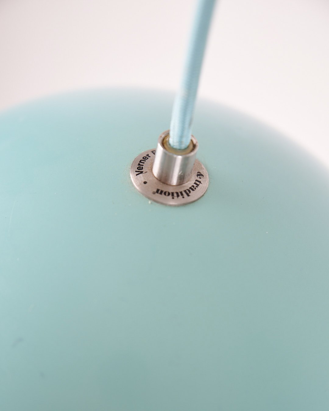 Flowerpot pendel, model VP1, designet af Verner Panton i 1968 og produceret af &Tradition. Lampen er udført i babyblå lakeret metal med det ikoniske dobbeltskærmsdesign.
