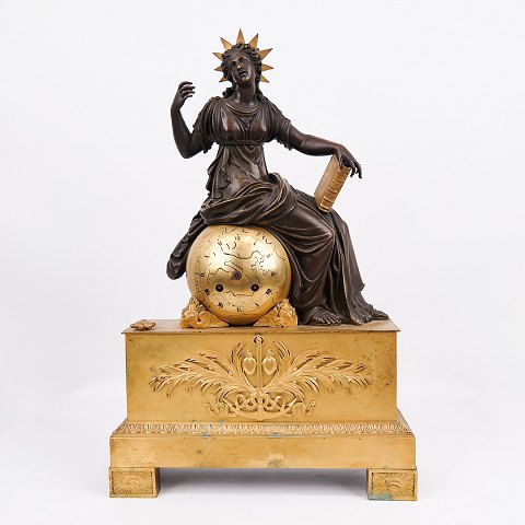 Fransk Kaminur - Bronze - Udsmykket Med Kvindefigur med strålekrone og bog - Paris - År 1820erne