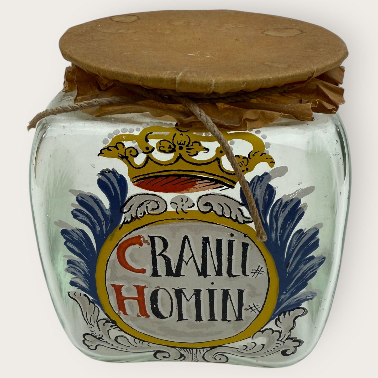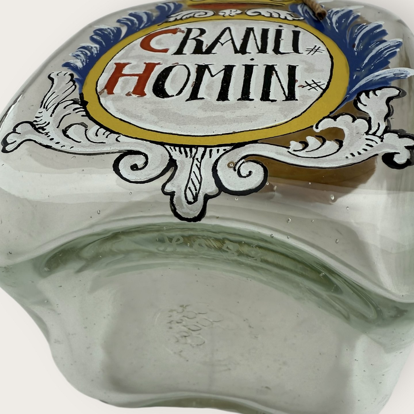 | Holmegaard apotekerflaske fra 1988, Cranu Homin, Mål: 10x8,5x8,5cm, flaskerne er mundblæste kopier af originale gamle apotekerflasker, Signeret Hg88.