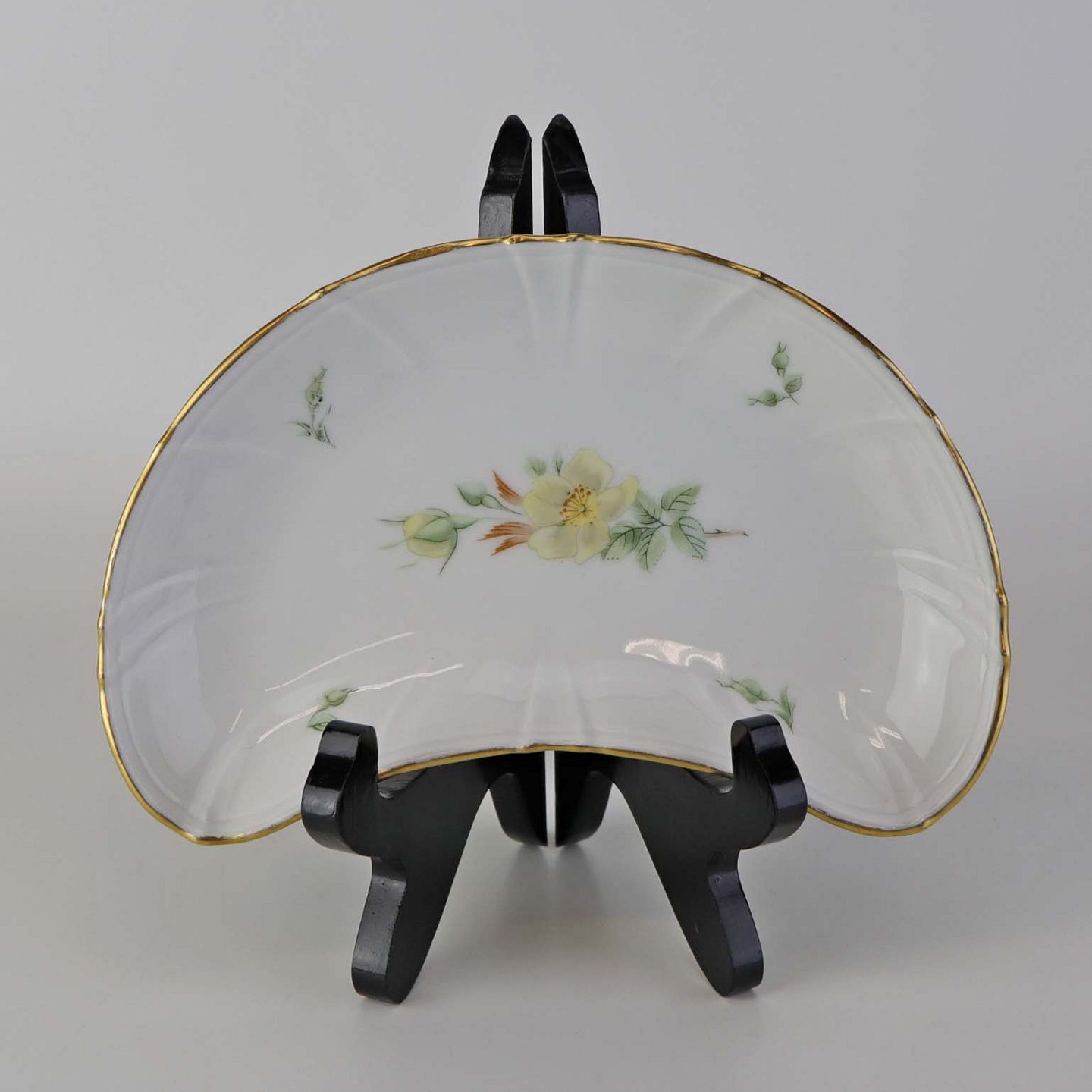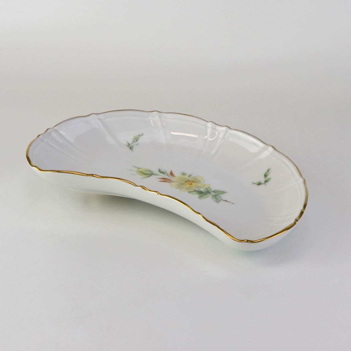 Halvmåneformet fad i porcelæn fra stellet Klitrose. Nr. 352