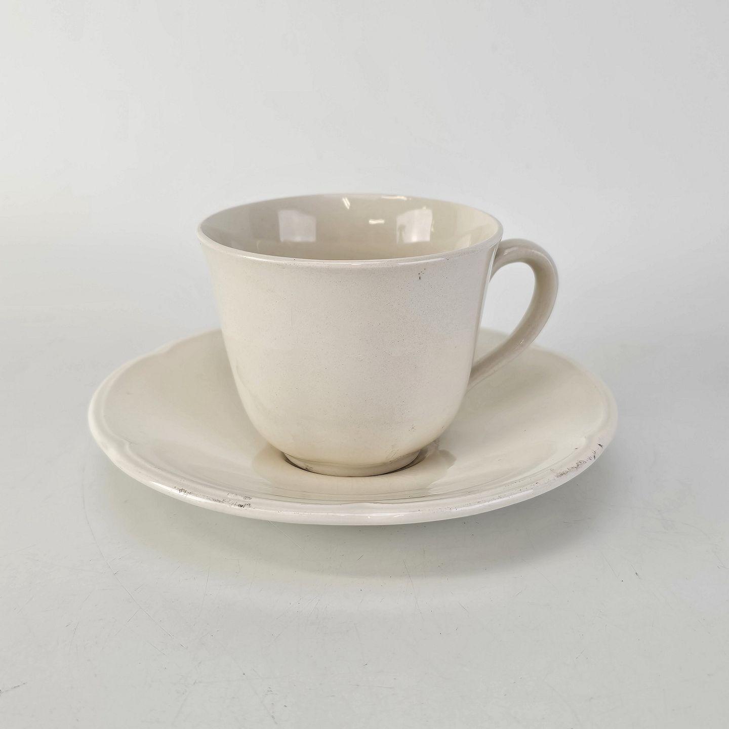 Kop og underkop i cremefarvet fajance fra stellet Alma