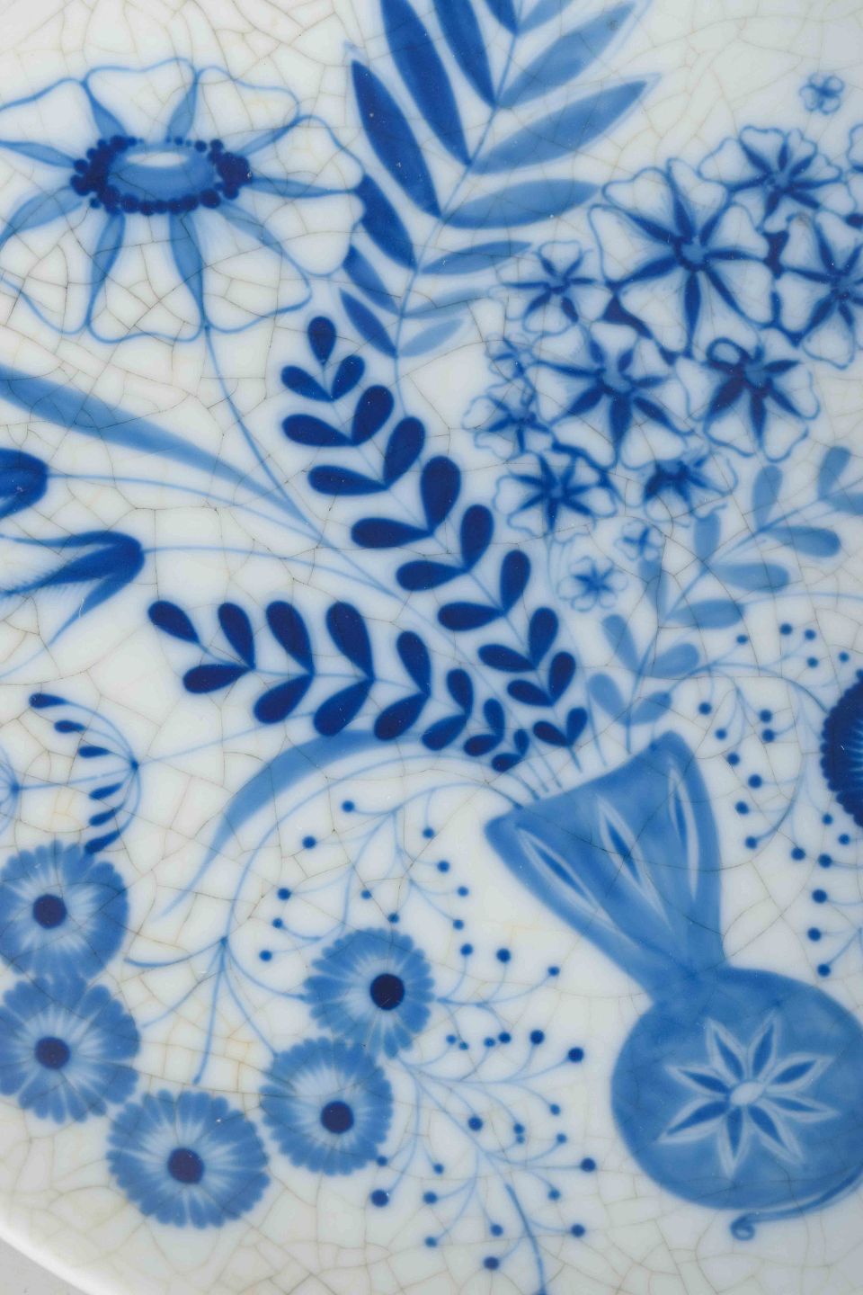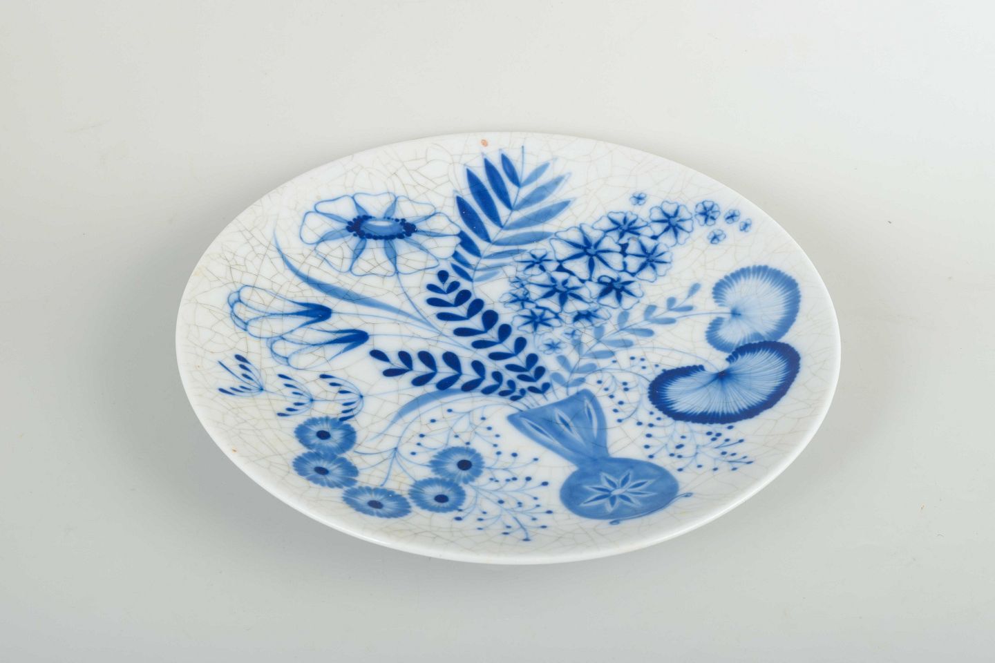 Rund tallerken i porcelæn/fajance med håndmalet blå dekoration i organisk blomster- og bladmotiv. Underglasur med tydeligt krakelé. Stemplet “Arabia Unika – Made in Finland” på bagsiden.
