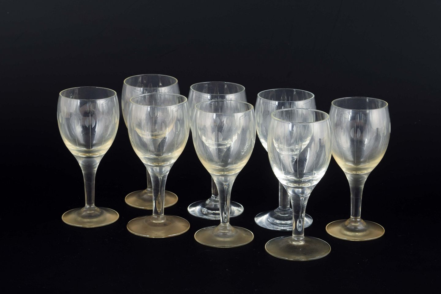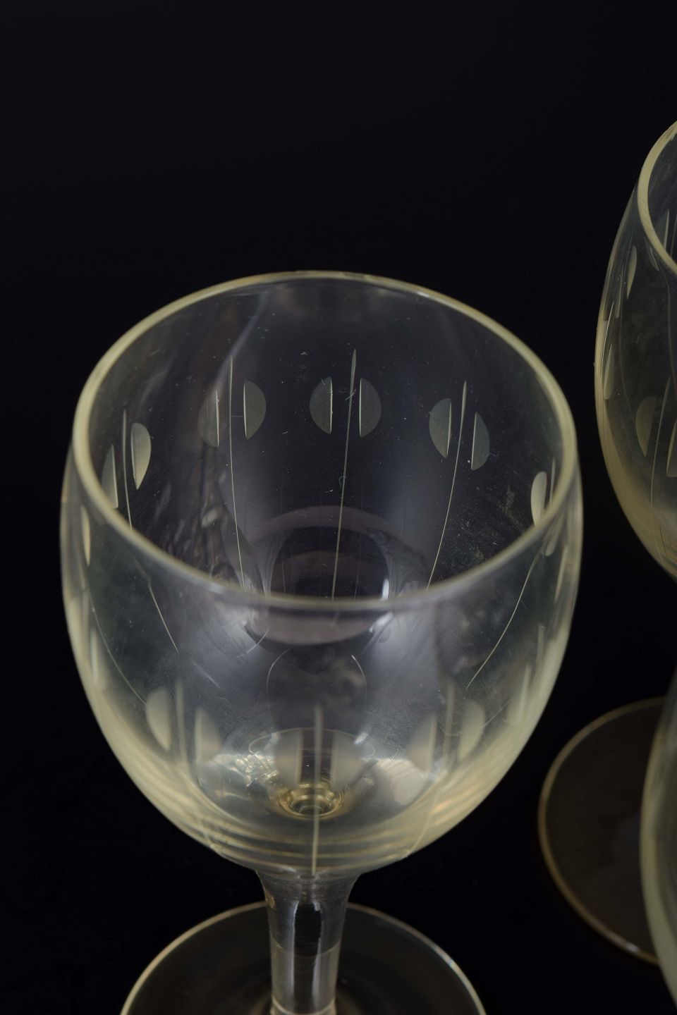 Mundblæste glas med kort stilk og høj, slank bowle. Dekoreret med indgraveret mønster i form af lodrette linjer med ovale elementer.