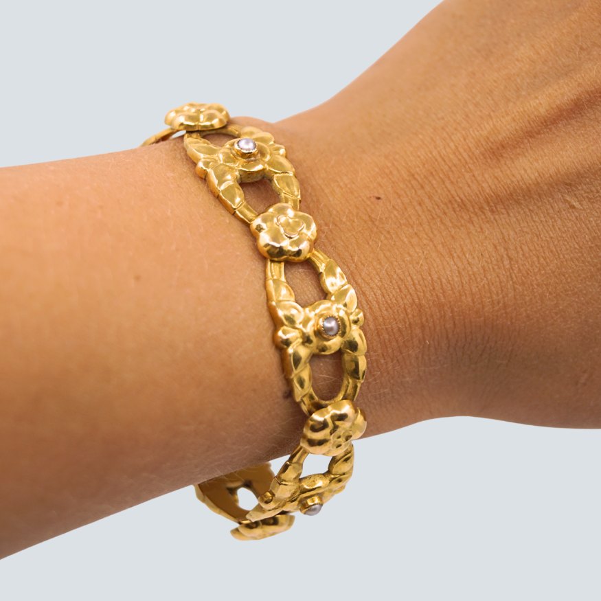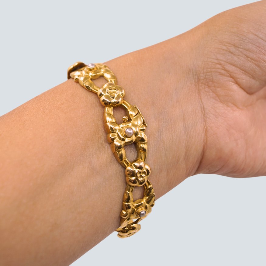 Skønvirke armbånd i 18 kt. guld. Leddelt og prydet med små perler.