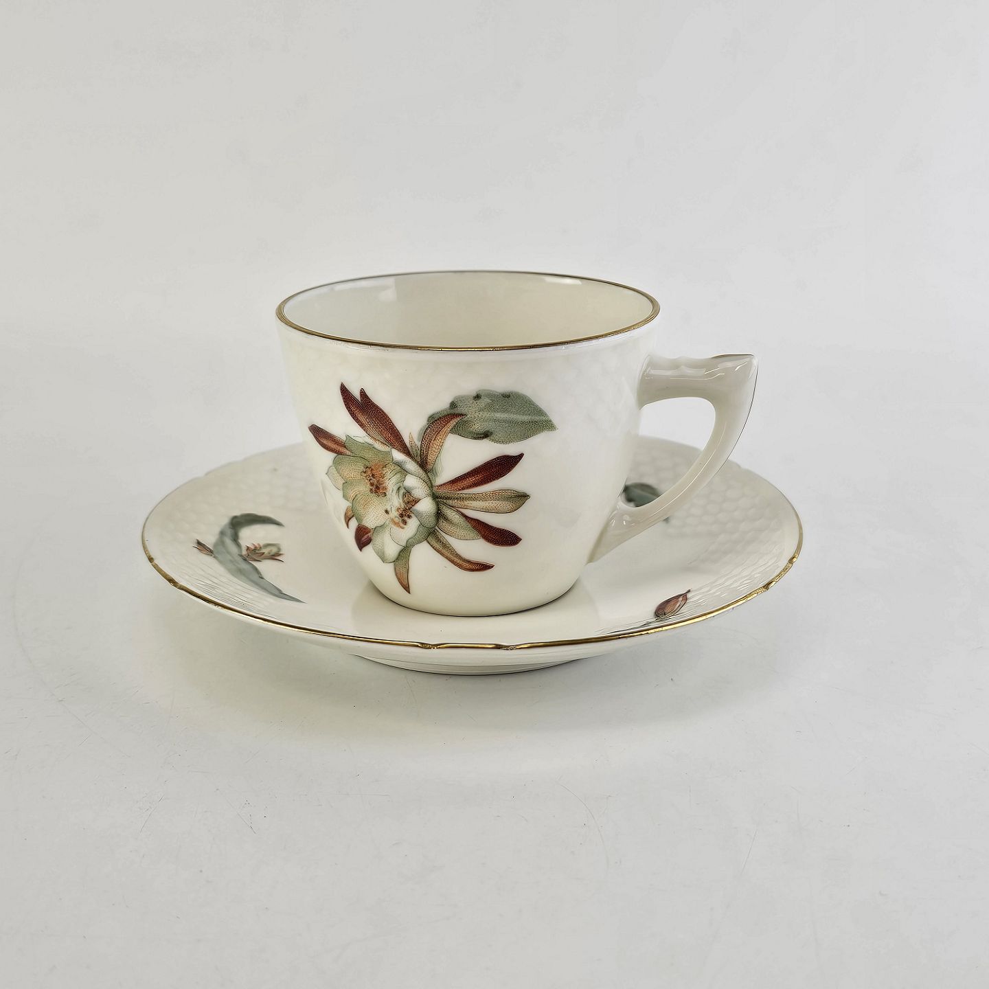Kaktus er cremefarvet porcelæn i skælform, dekoreret med kaktusblomster og guldkant