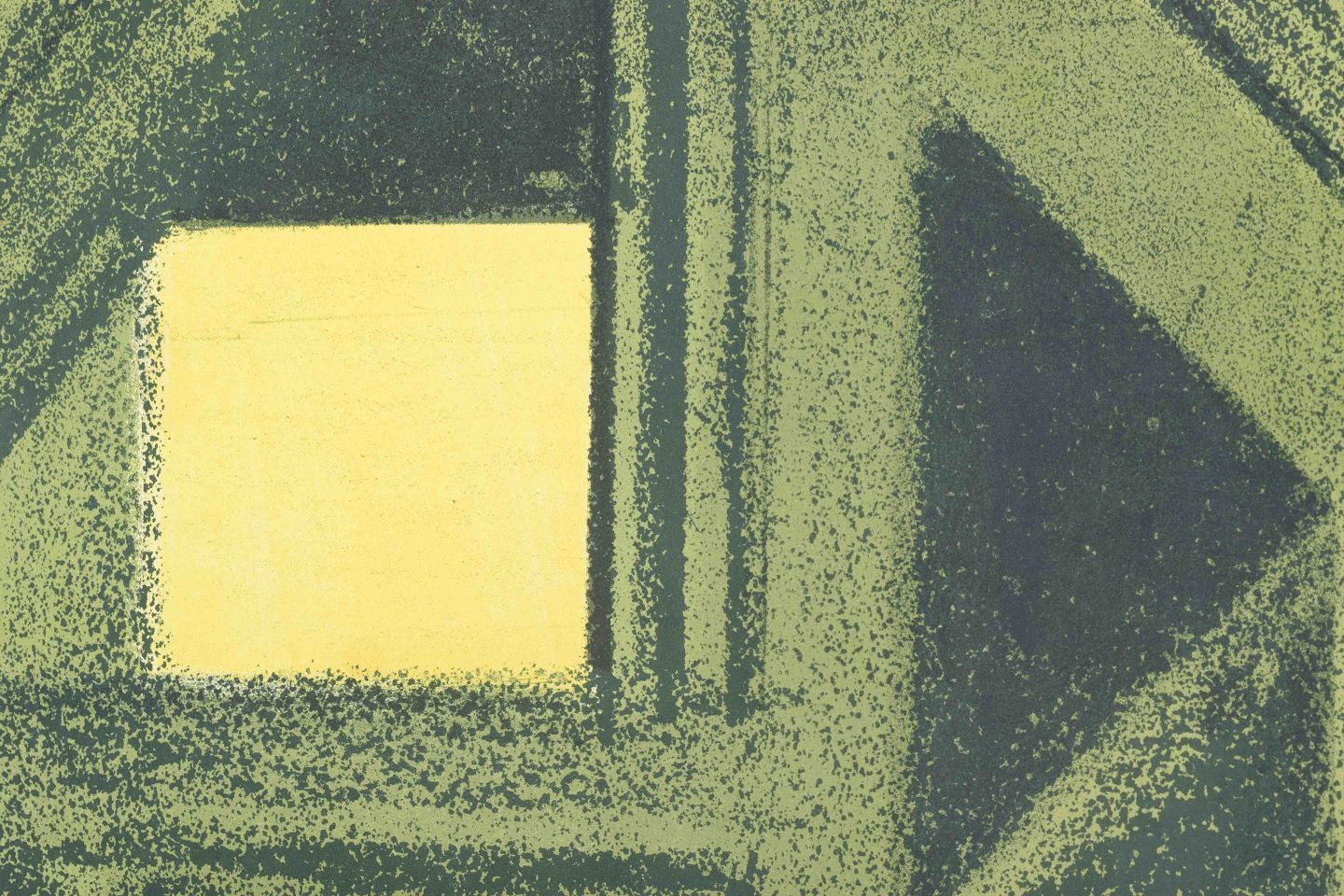 Abstrakt komposition med geometriske felter i grønne nuancer, hvor et centralt gult kvadrat skaber en markant kontrast og fremhæver værkets titel “Mod lyset”. Trykket rummer Arne L. Hansens karakteristiske fornemmelse for lys, struktur og stoflighed, som kendes fra hans arbejde både som maler og grafiker.